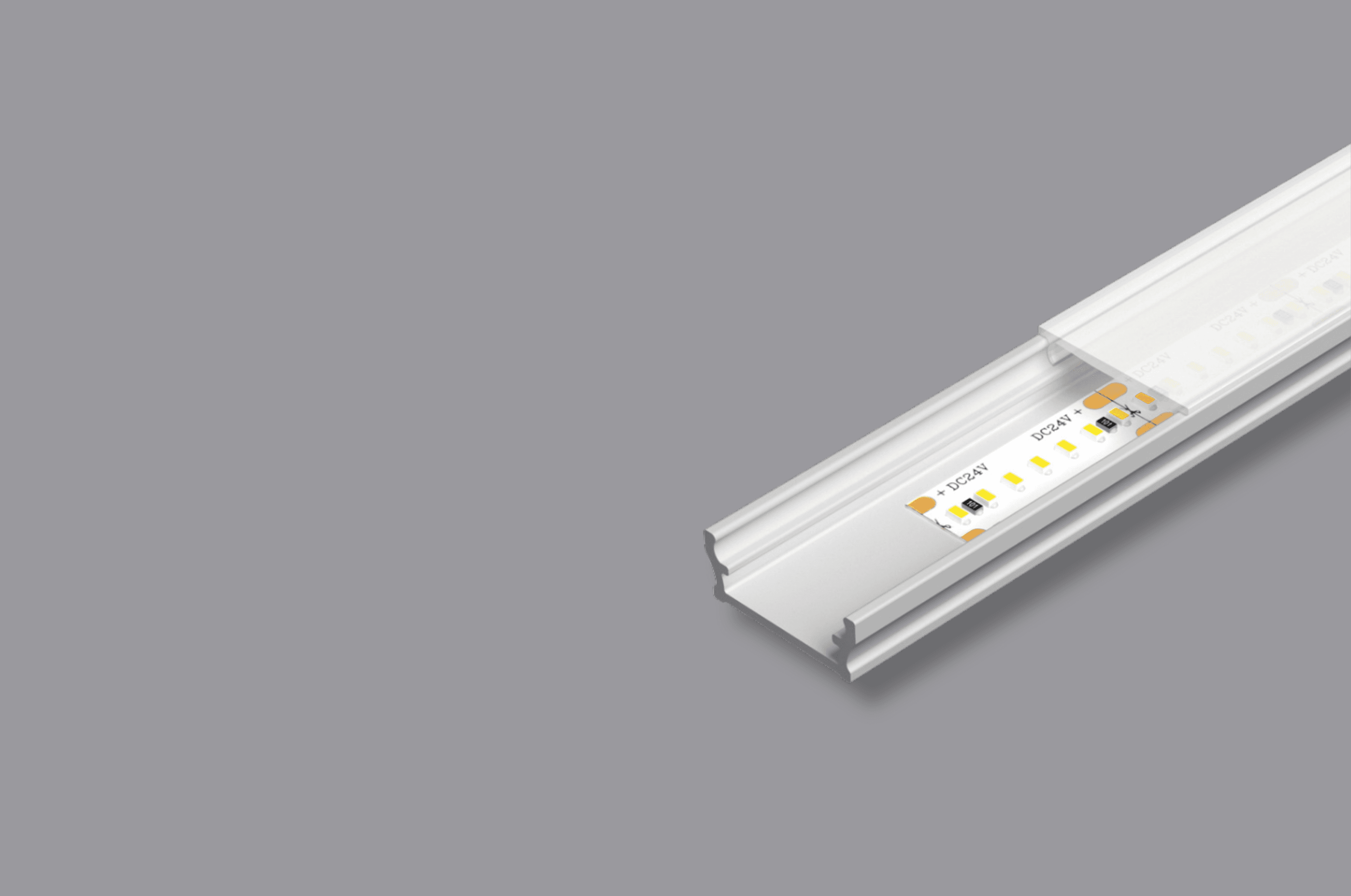 Aluminiumprofil LED, vorgesehen für den flächenbündigen Einbau, ideal für subtile Installationen in Möbeln und Wänden.