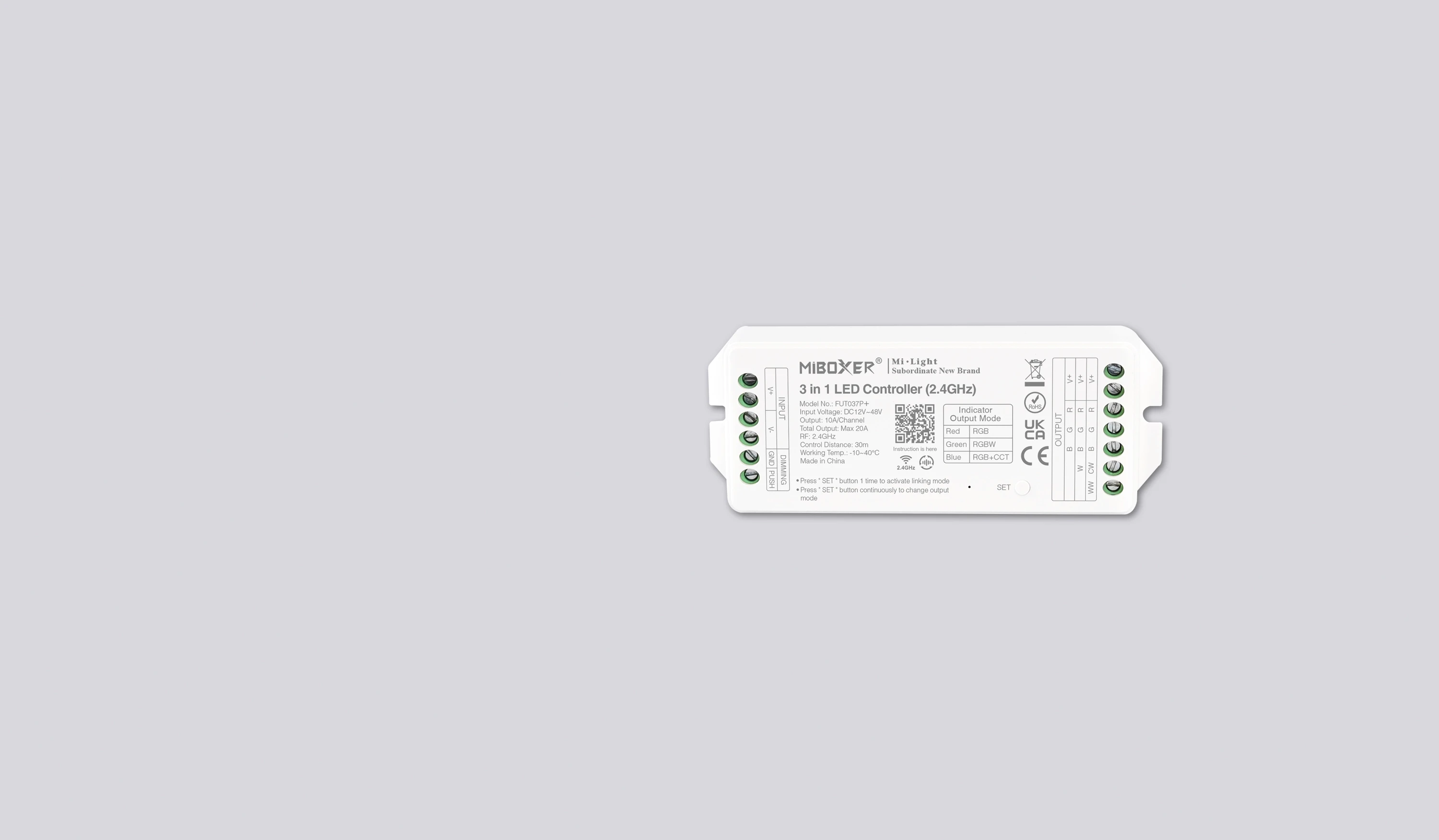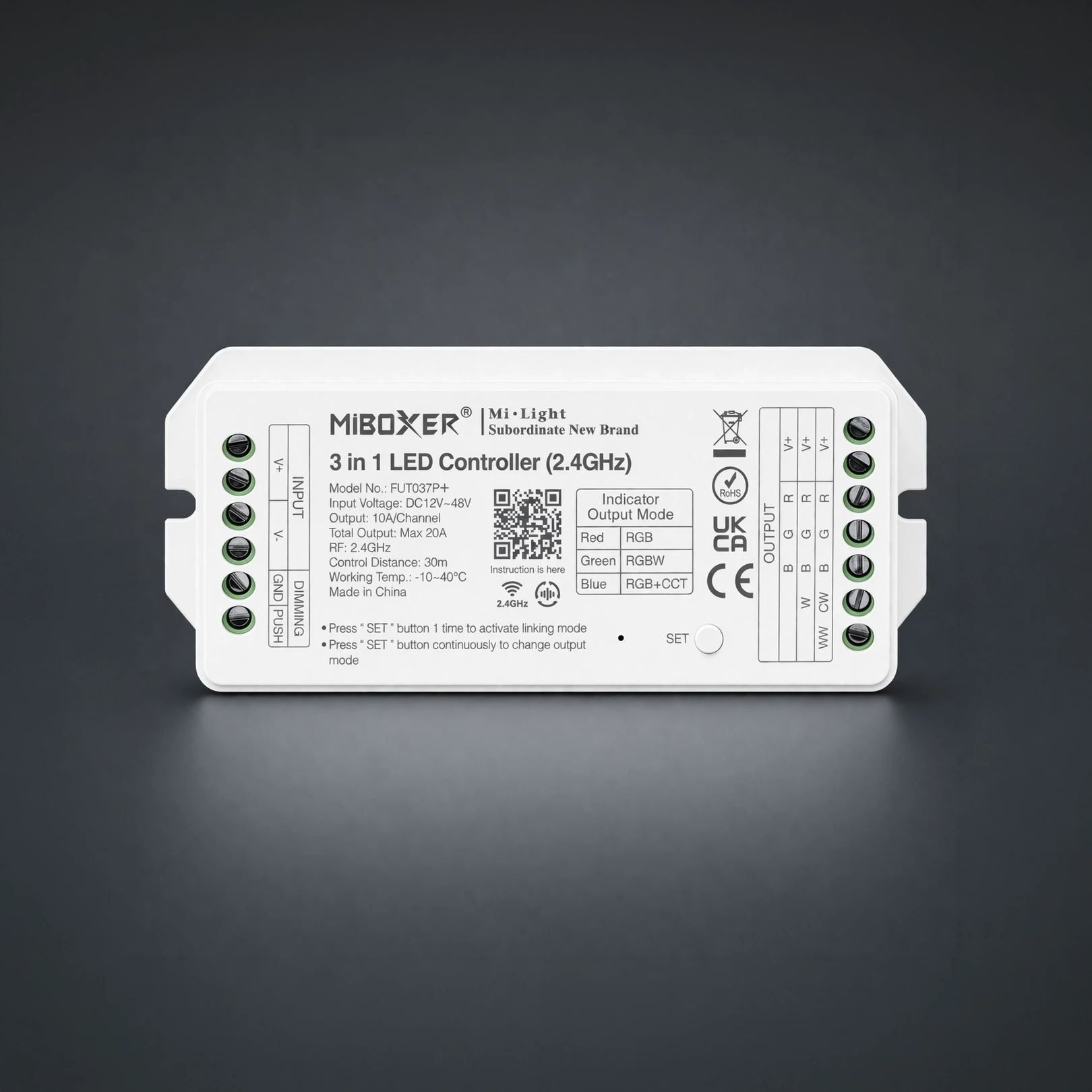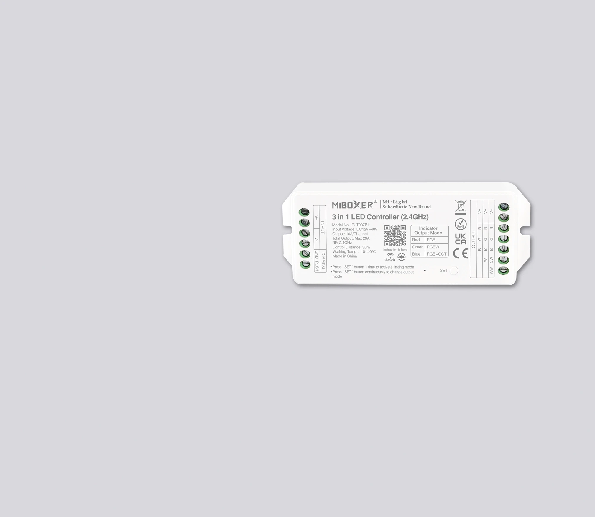 FUT037P+ ermöglicht die Steuerung von LED-Beleuchtung in den Modi RGB, RGBW sowie RGB+CCT über Fernbedienungen und das 2.4-GHz-System. Dank der hohen Leistungsfähigkeit eignet es sich für umfangreiche gewerbliche Installationen.