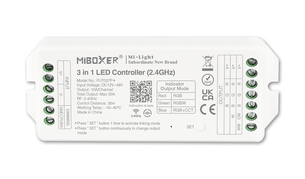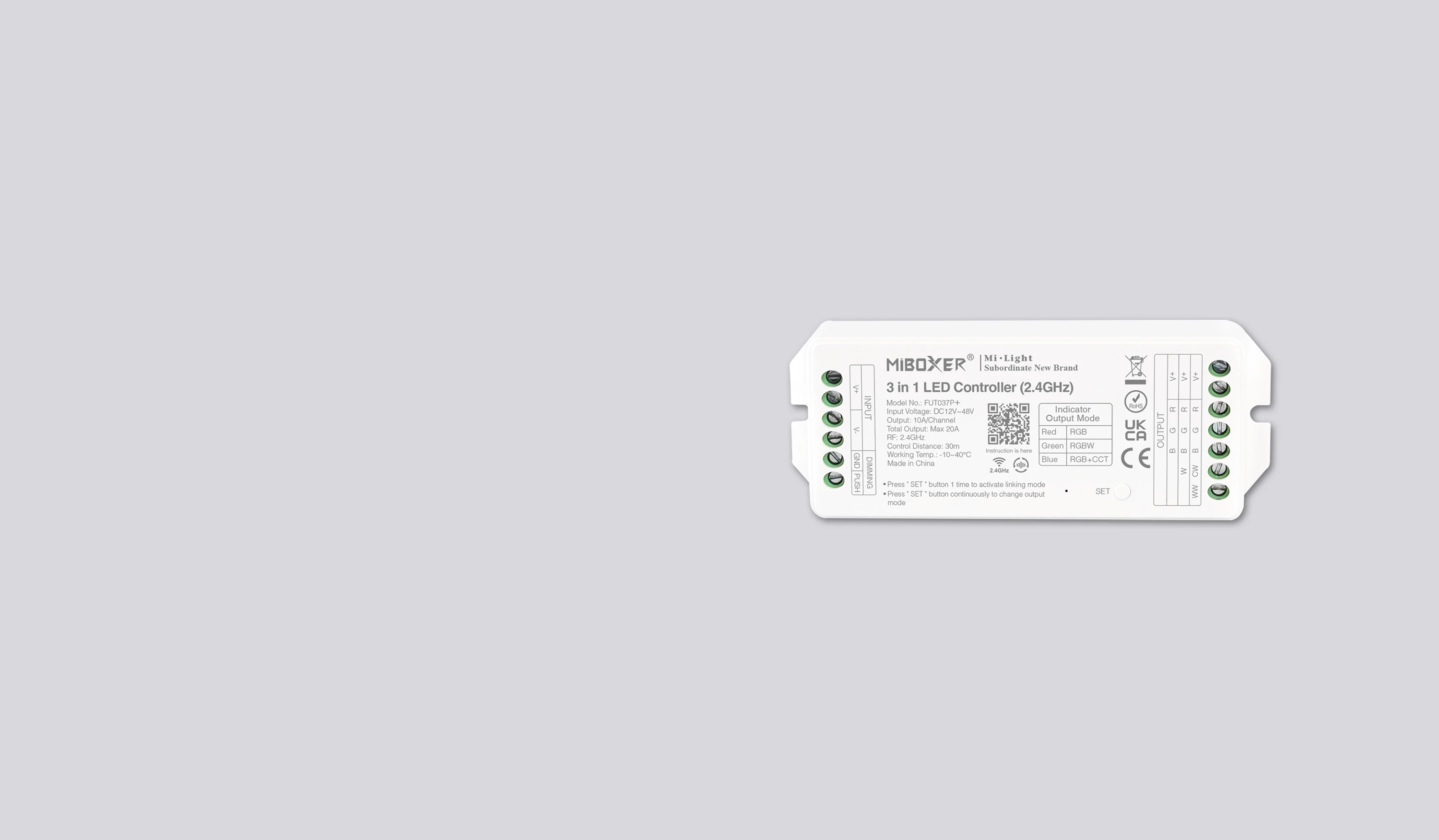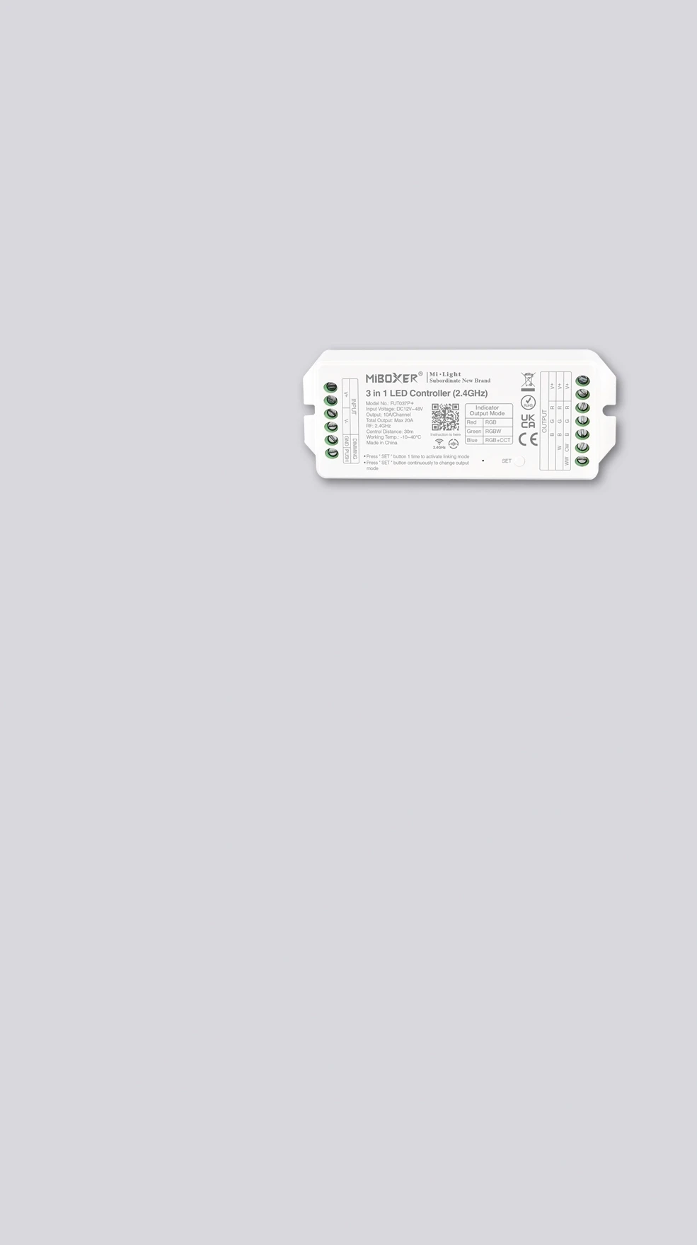 FUT037P+ ermöglicht die Steuerung von LED-Beleuchtung in den Modi RGB, RGBW sowie RGB+CCT über Fernbedienungen und das 2.4-GHz-System. Dank der hohen Leistungsfähigkeit eignet es sich für umfangreiche gewerbliche Installationen.