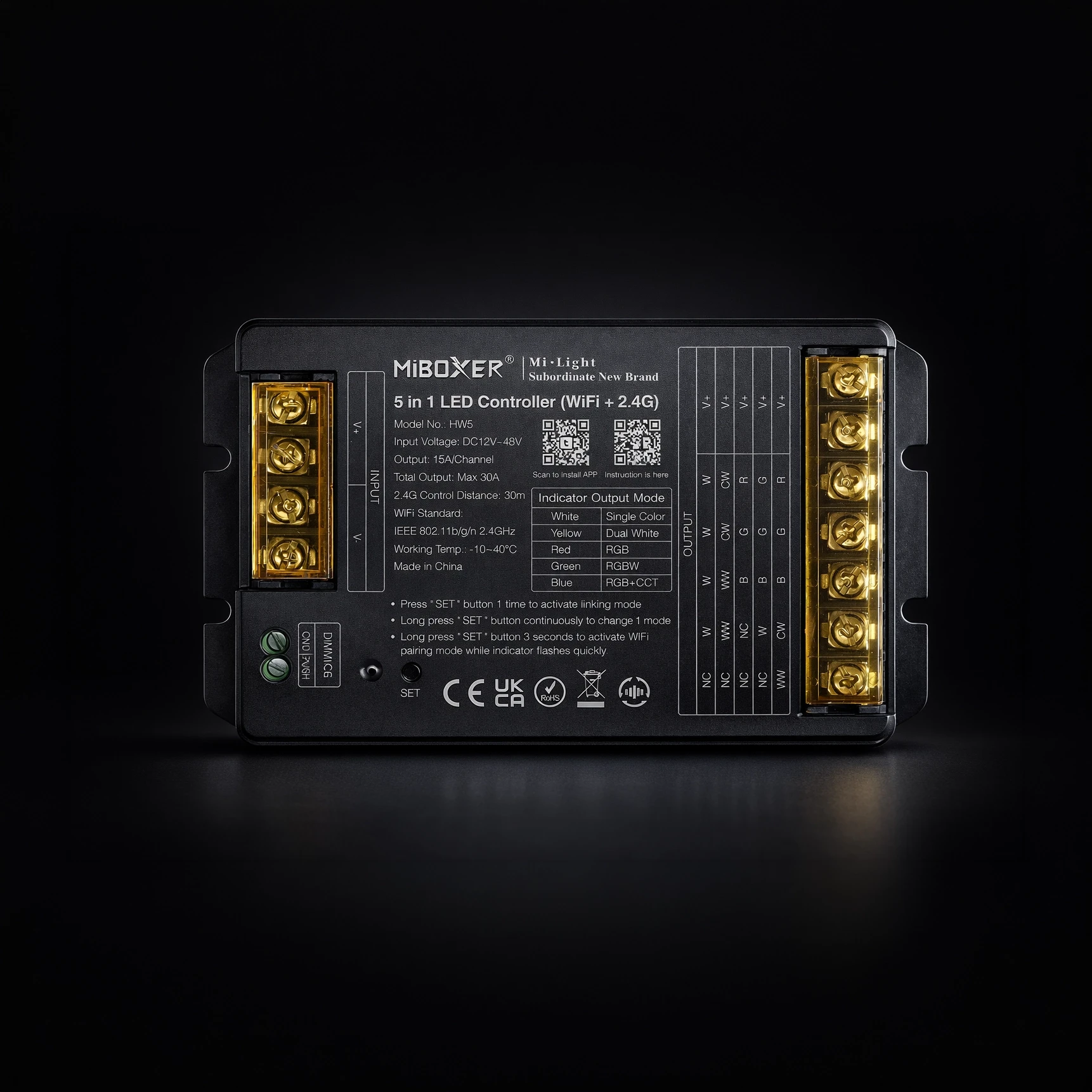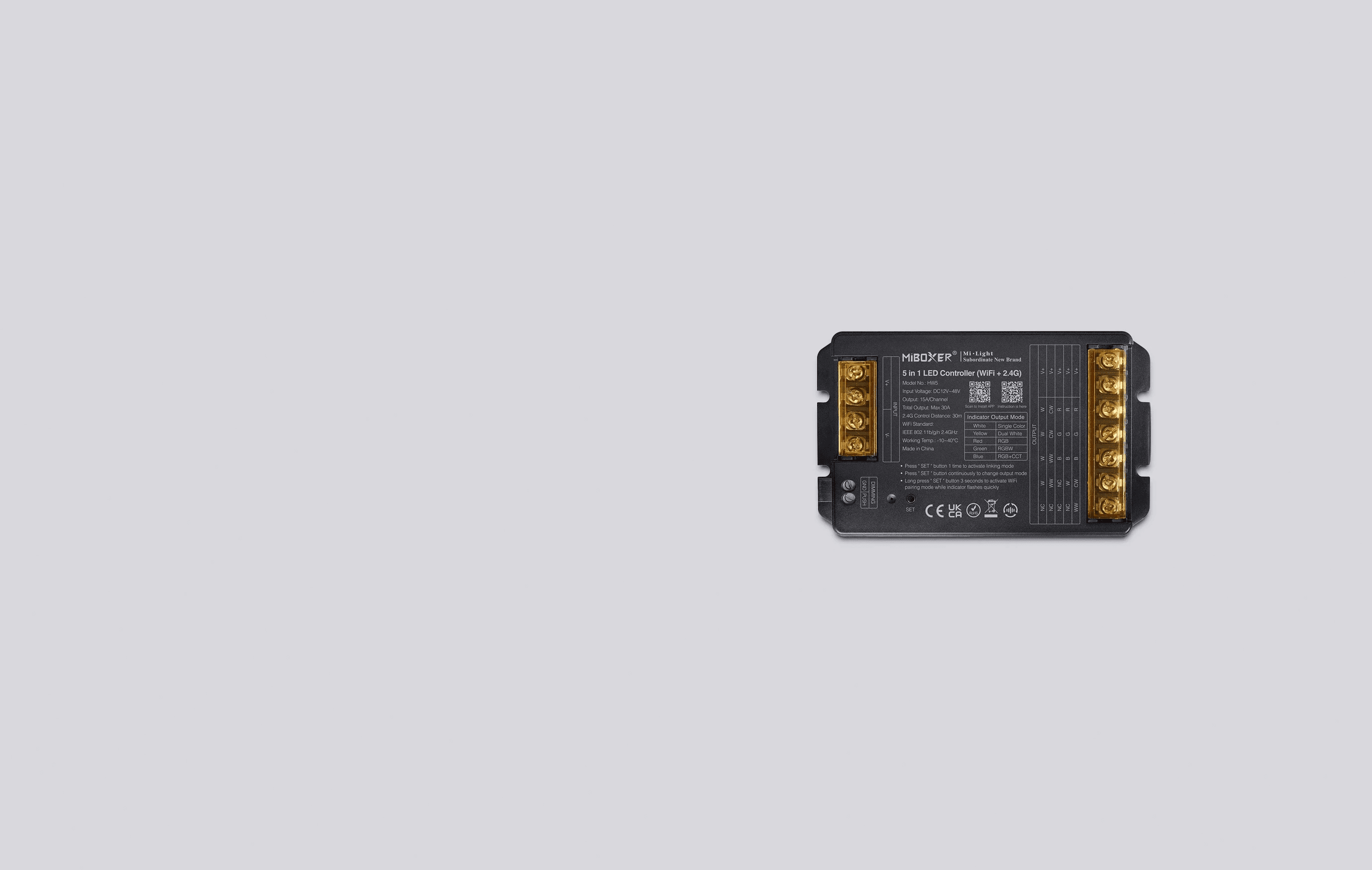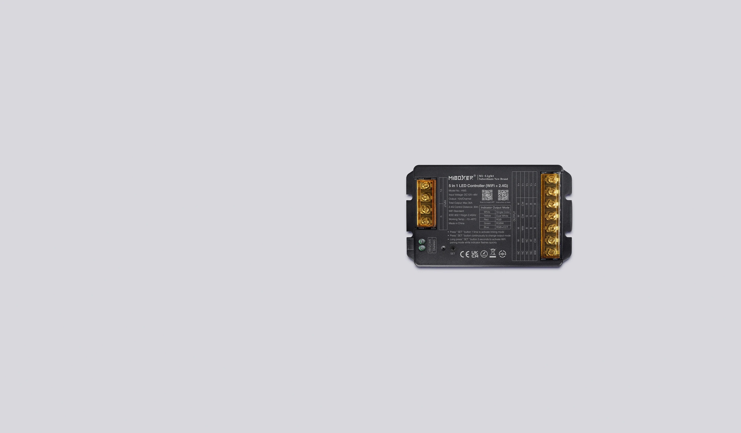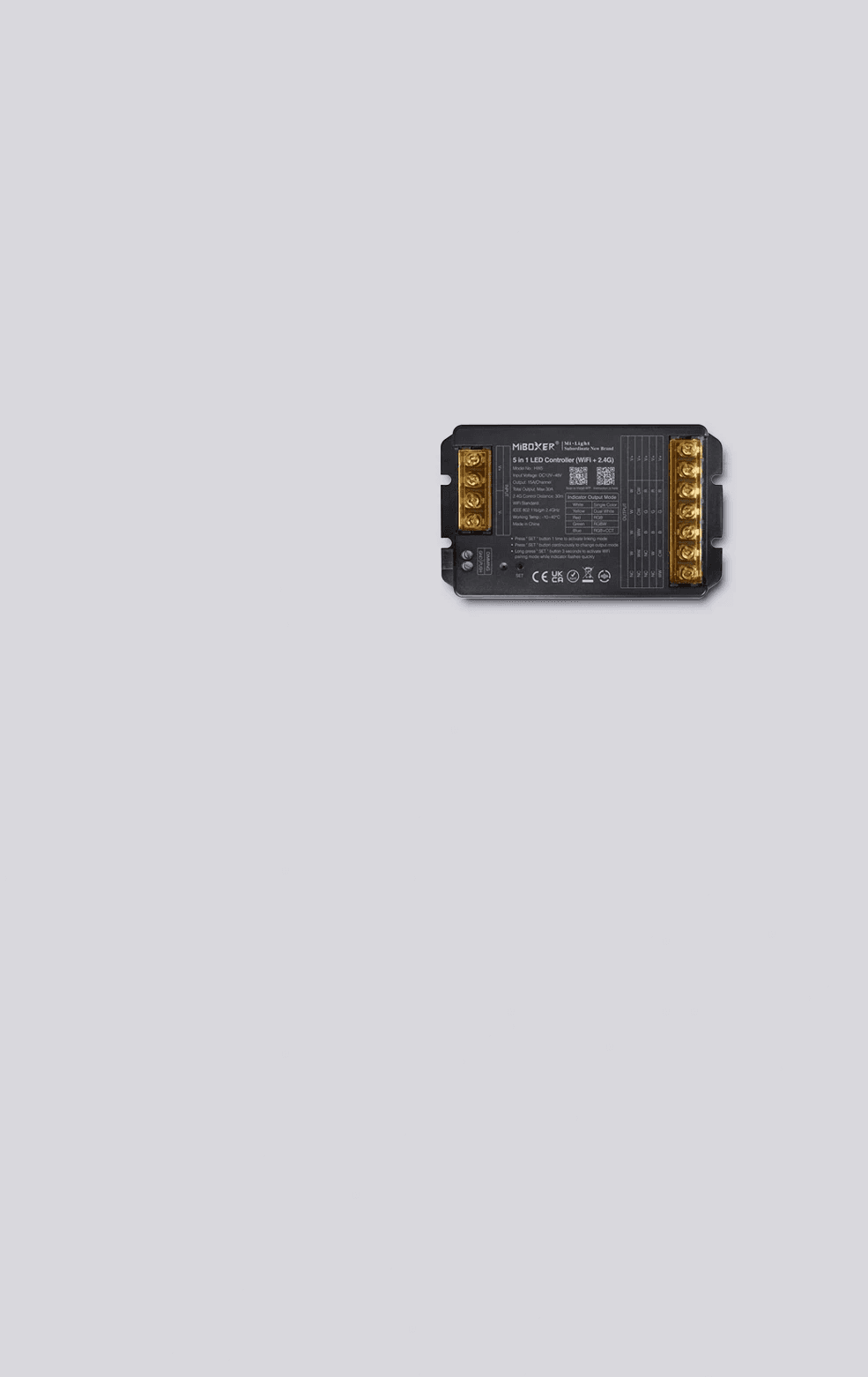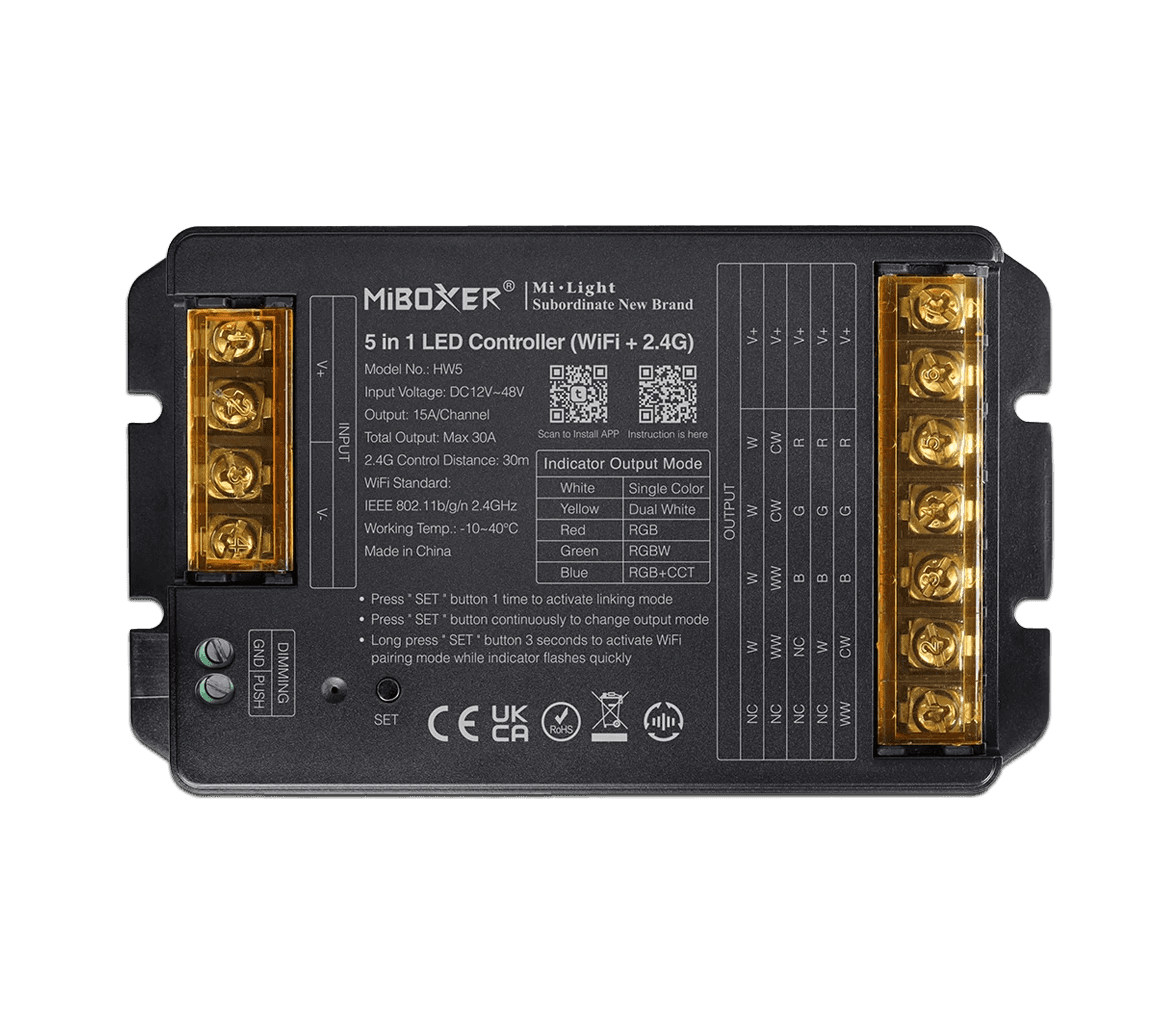 HW5 enables LED lighting control in MONO, CCT, RGB, RGBW and RGB+CCT modes using an app, remote controls and the 2.4 GHz system. It ensures stable operation in smart home systems.