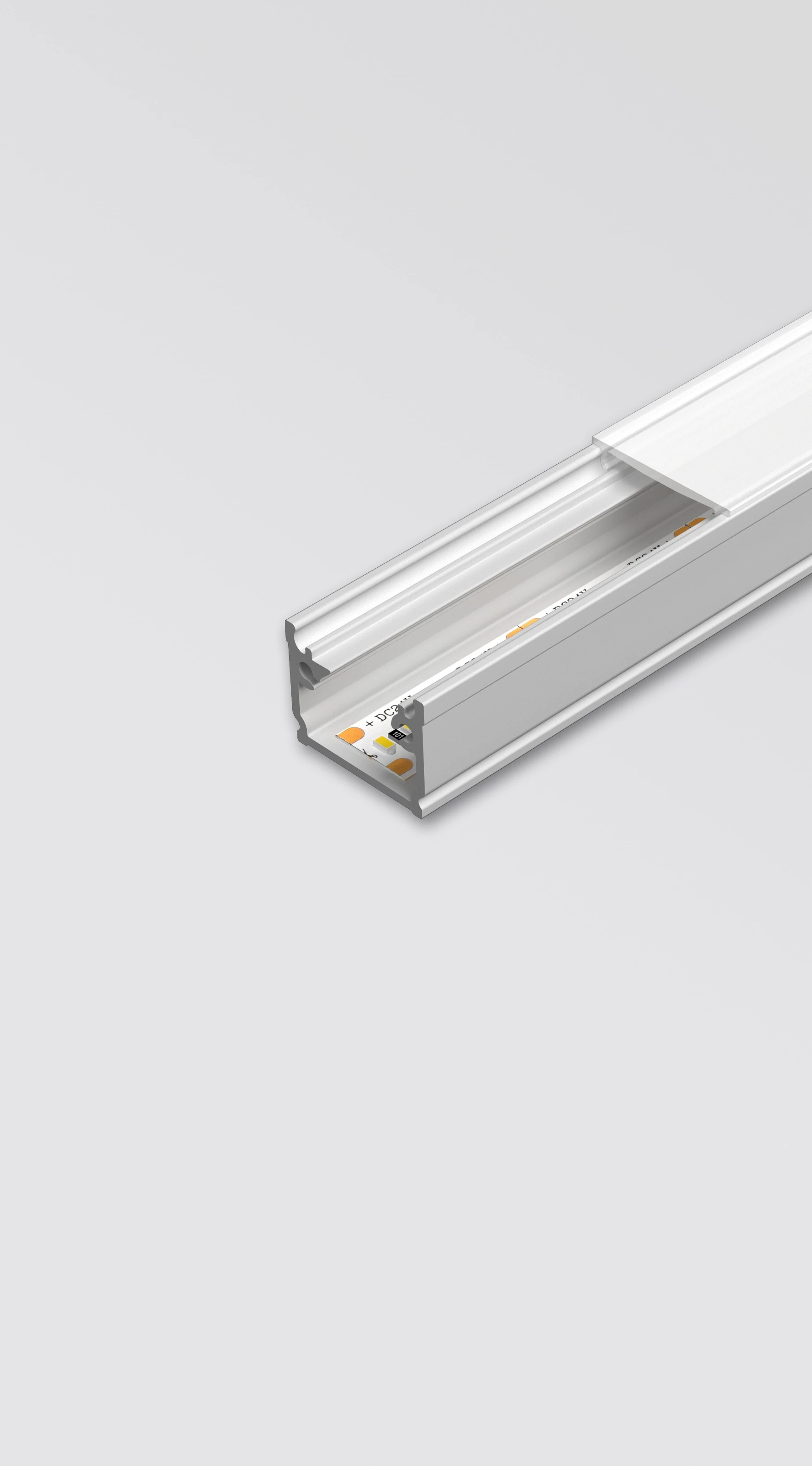 Profil en aluminium solide pour montage encastré et en surface, avec un cache recouvrant les bords pour un effet propre et moderne.