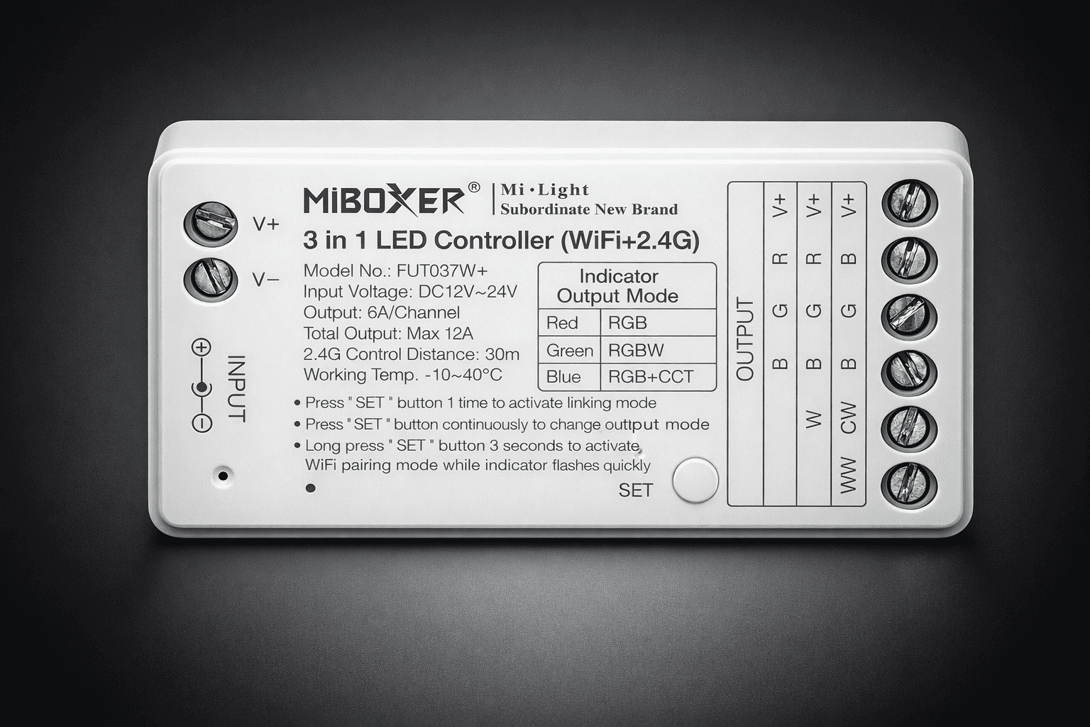 Contrôleur LED avec communication WiFi, Bluetooth et 2,4 GHz.