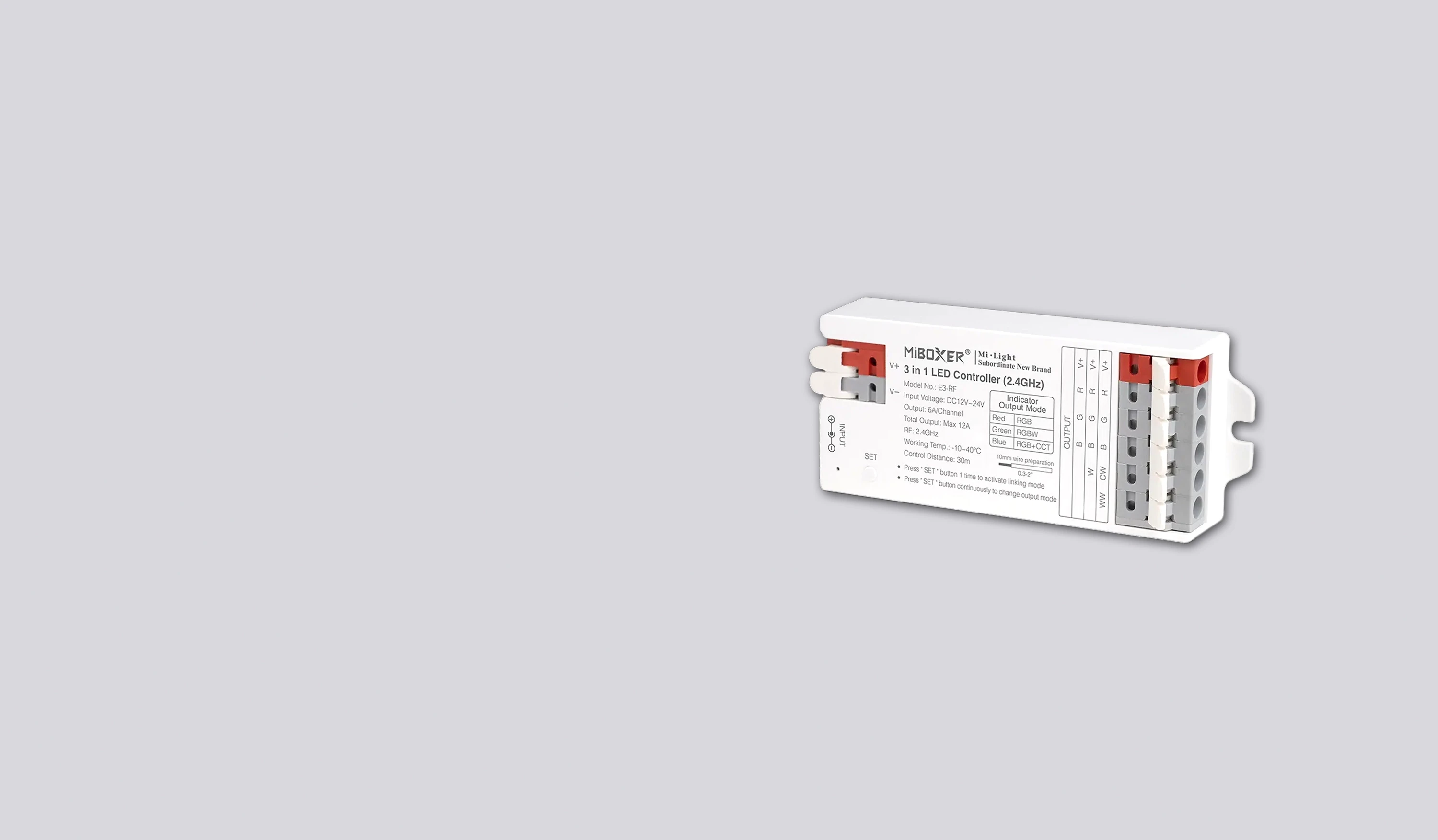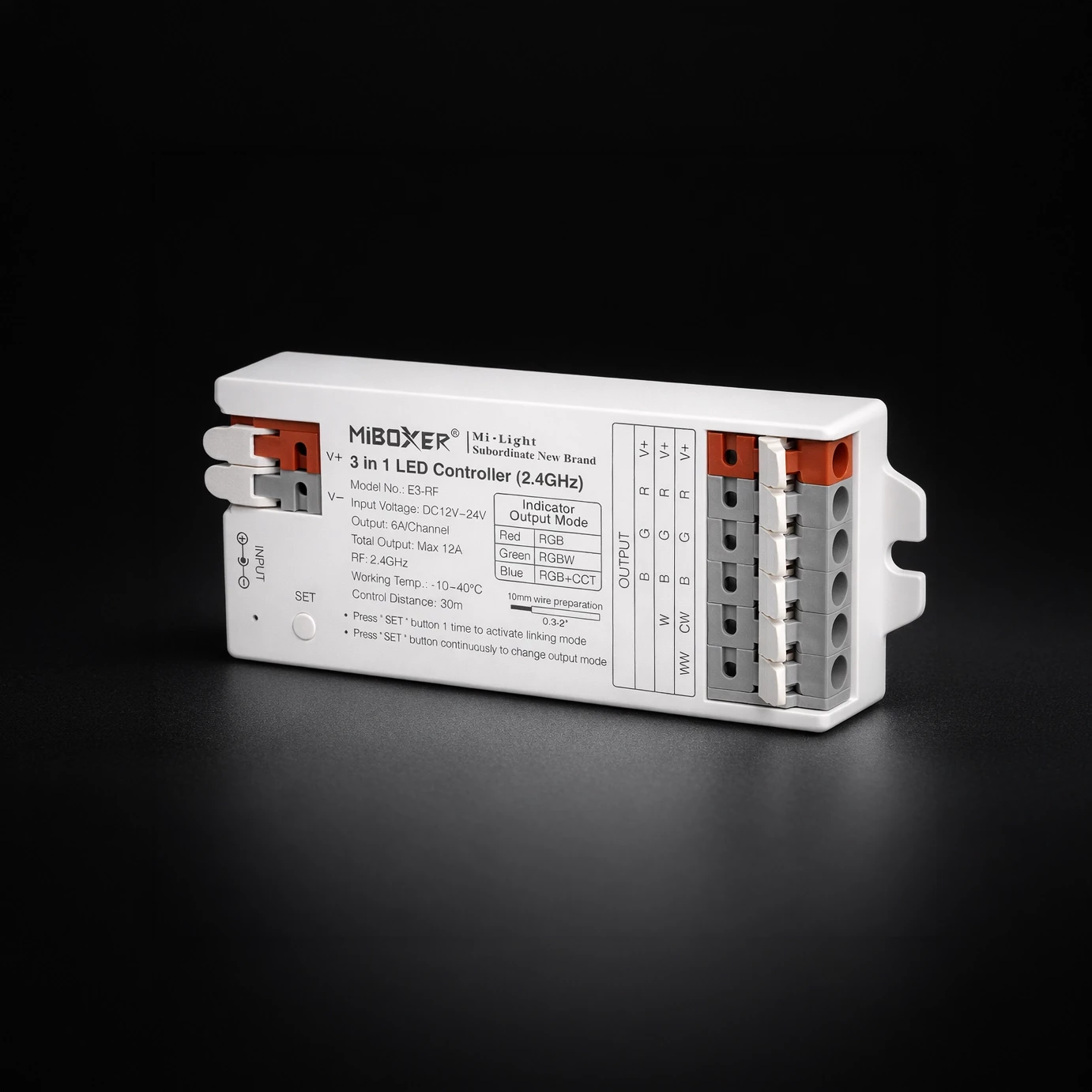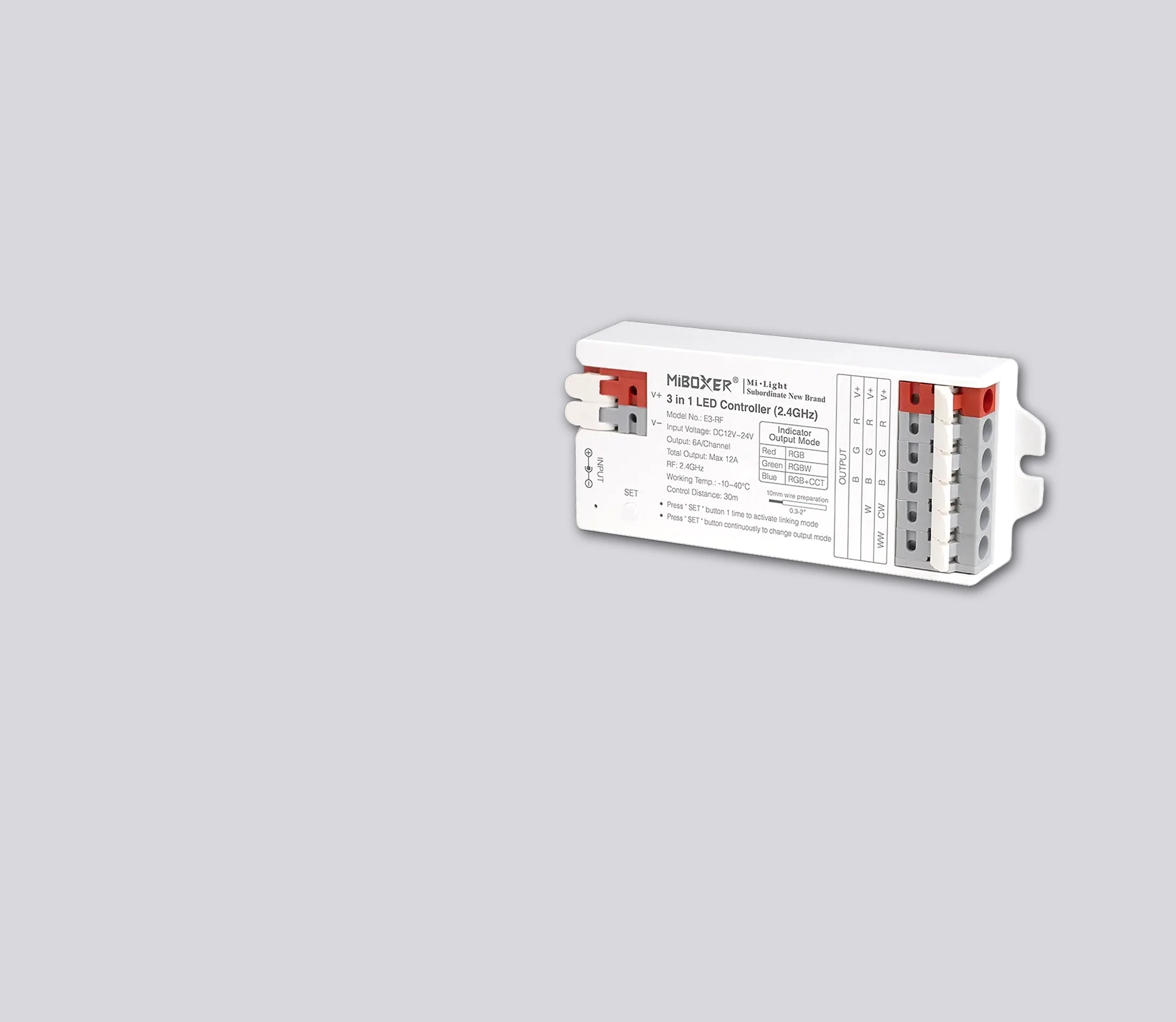 E3-RF umożliwia bezprzewodowe sterowanie oświetleniem LED w trybach RGB, RGBW oraz RGB+CCT. Dzięki funkcji komunikacji między urządzeniami i zasilaniu AC sprawdza się w większych instalacjach.