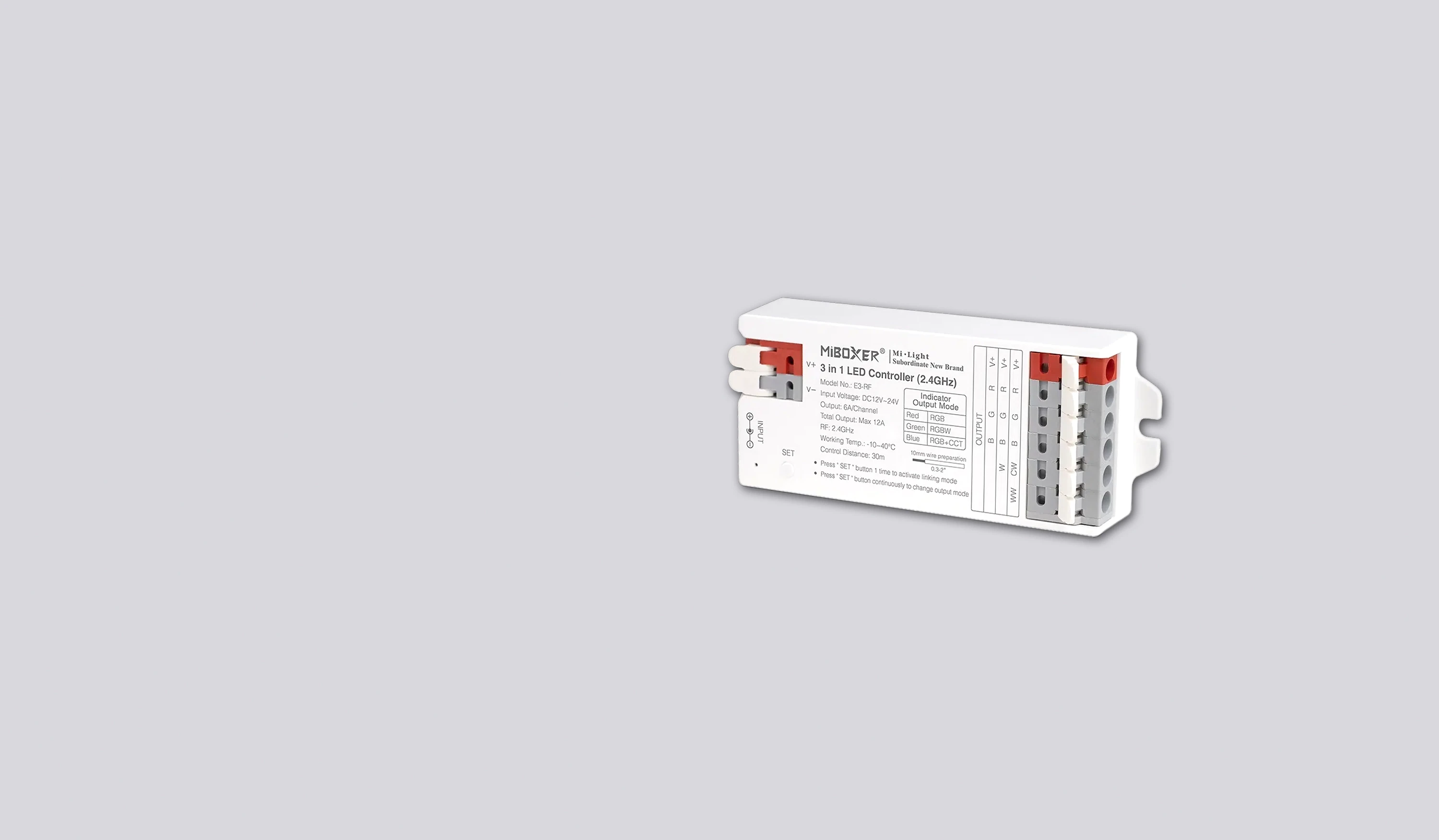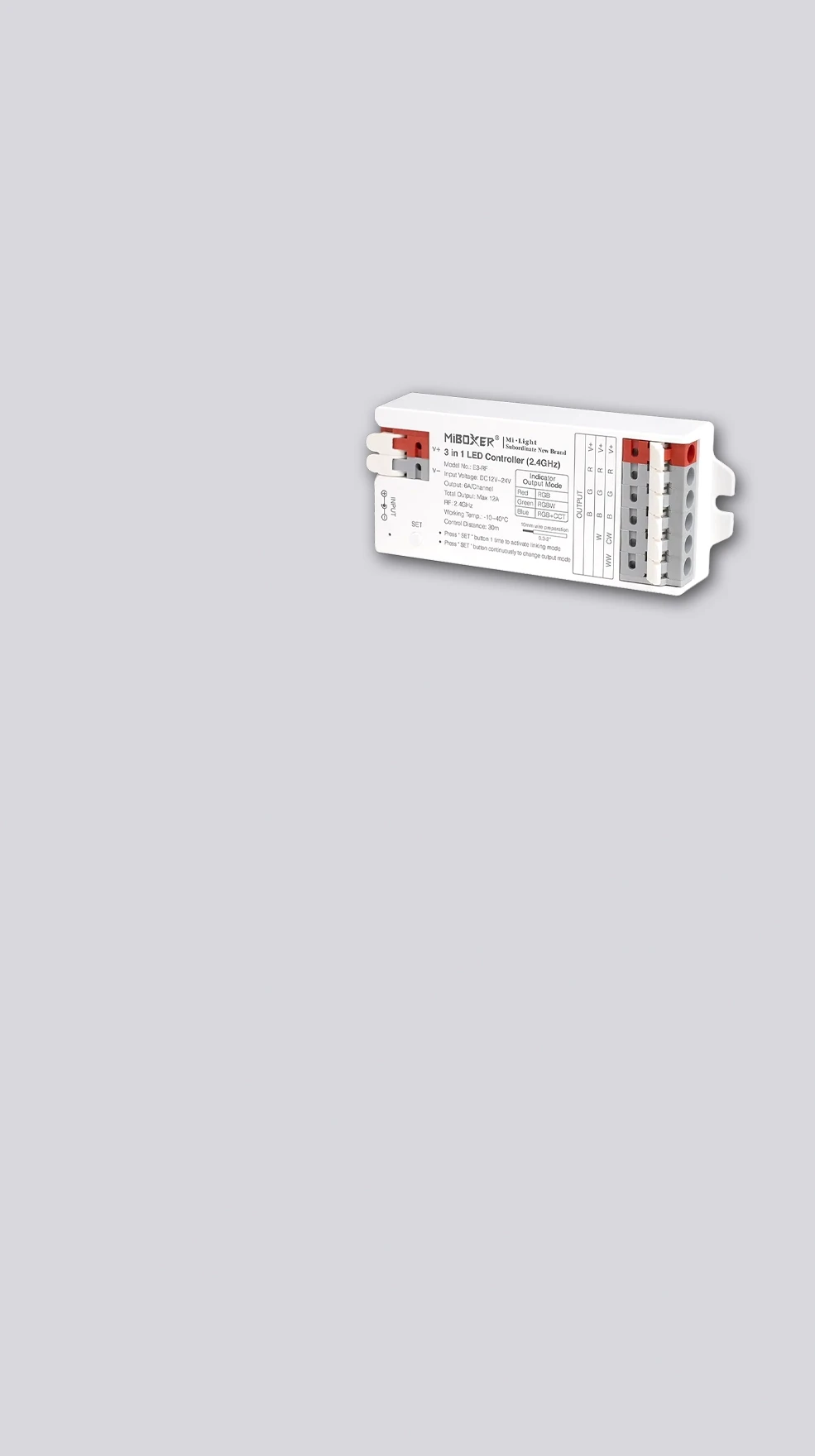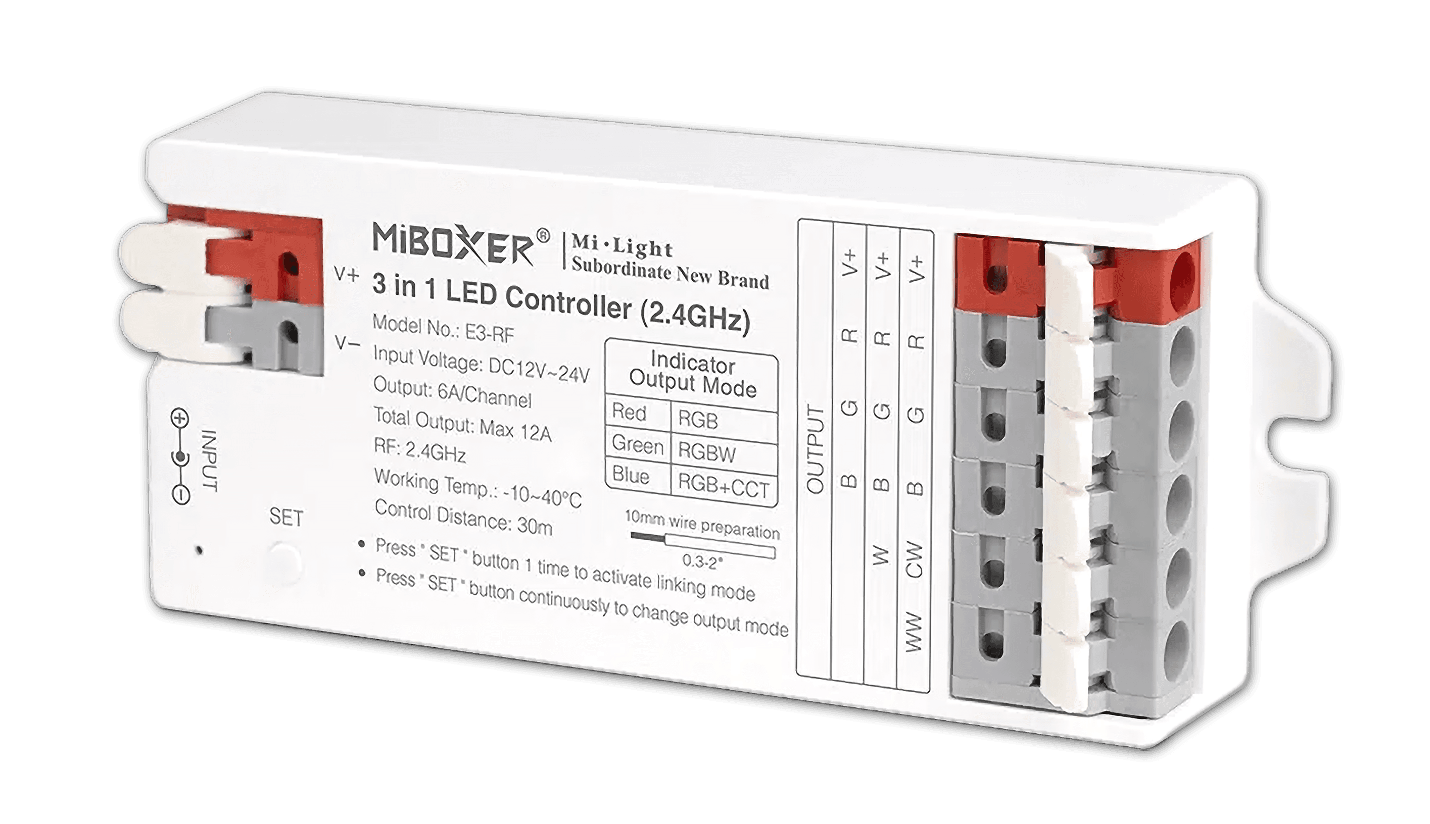 E3-RF umożliwia bezprzewodowe sterowanie oświetleniem LED w trybach RGB, RGBW oraz RGB+CCT. Dzięki funkcji komunikacji między urządzeniami i zasilaniu AC sprawdza się w większych instalacjach.