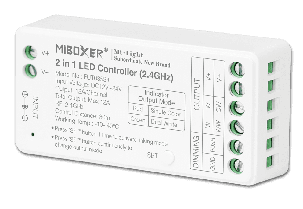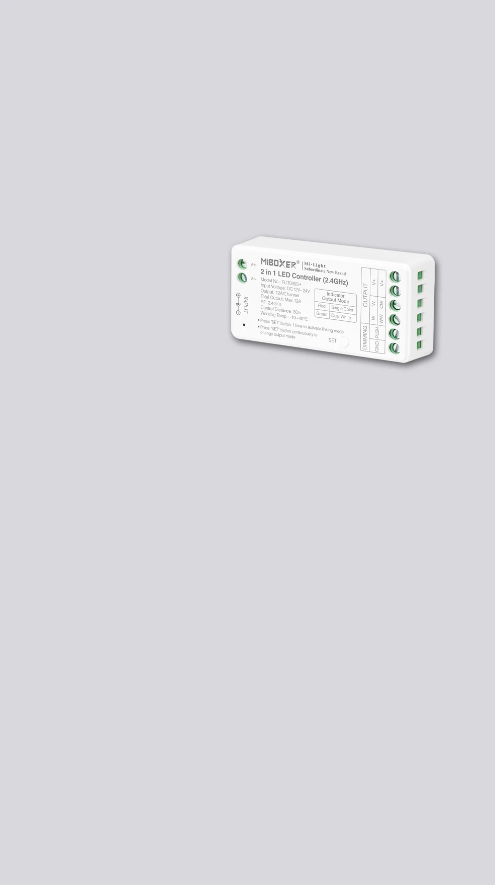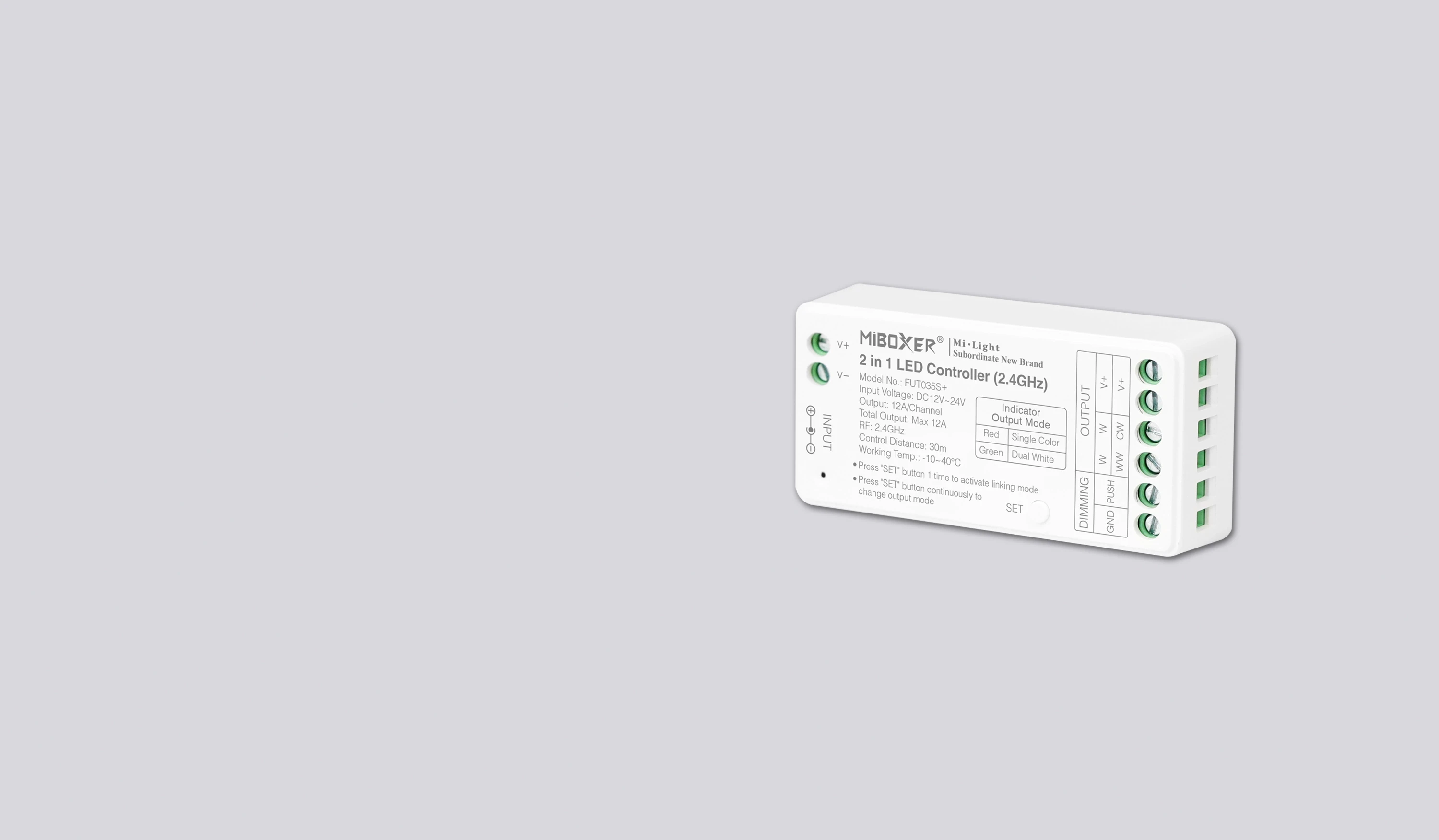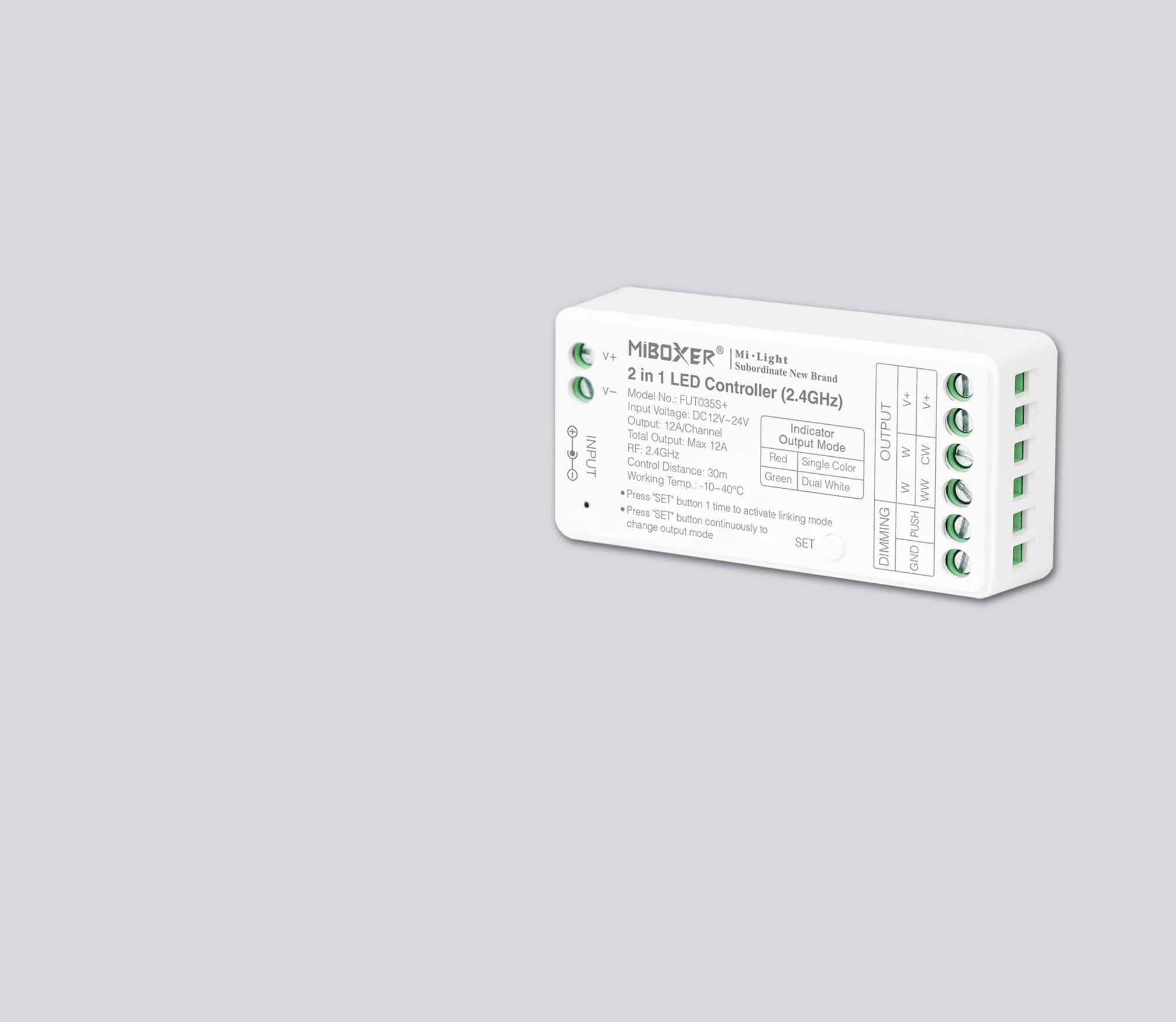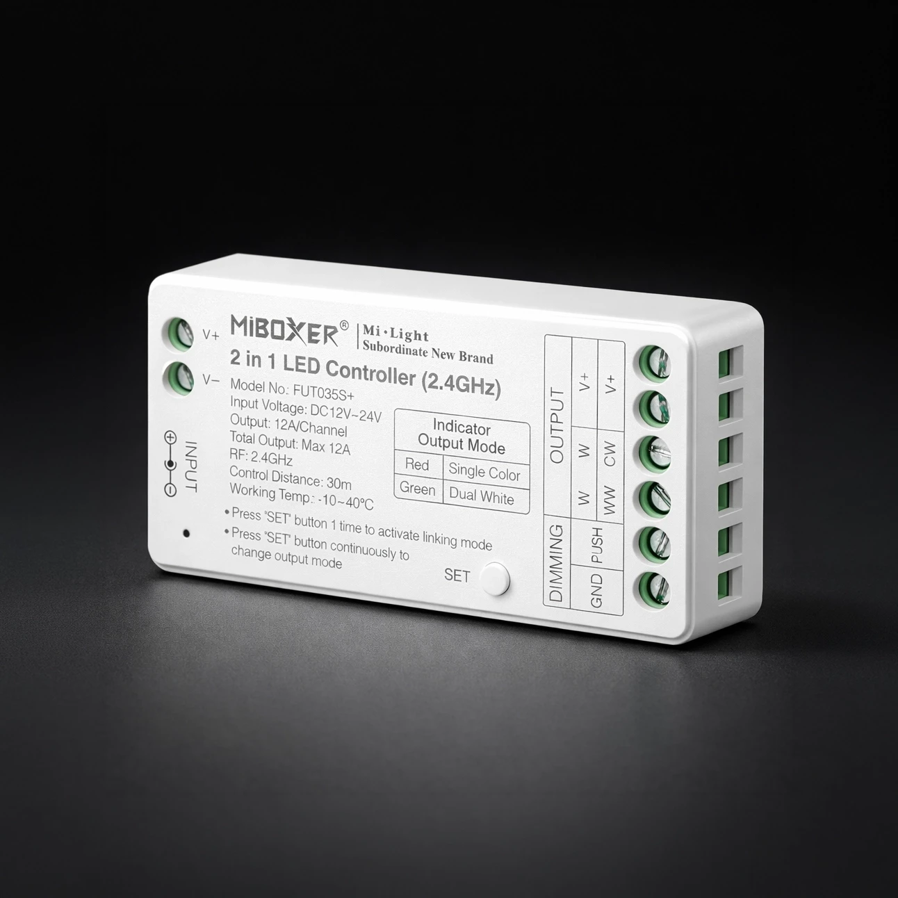 FUT035S+ umożliwia bezprzewodowe sterowanie oświetleniem LED w trybie mono i CCT za pomocą pilotów oraz paneli 2.4 GHz. Sprawdza się w instalacjach wymagających stabilnej i szybkiej kontroli światła.