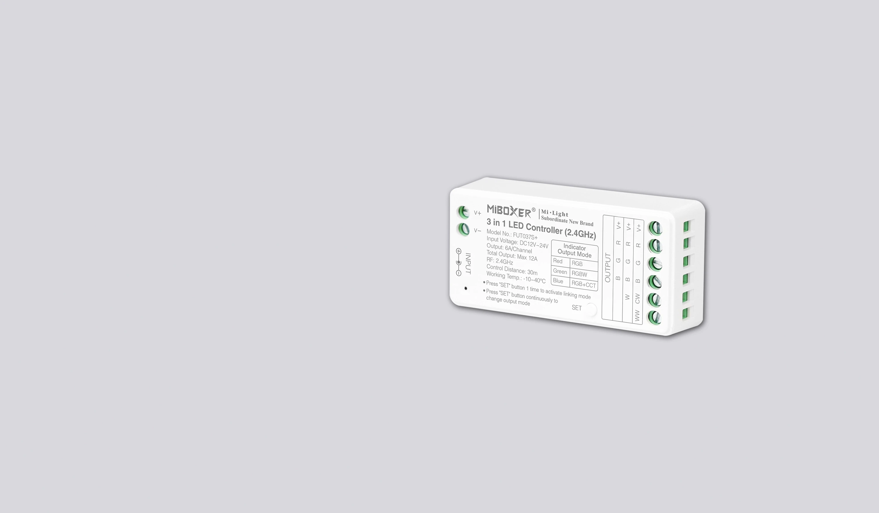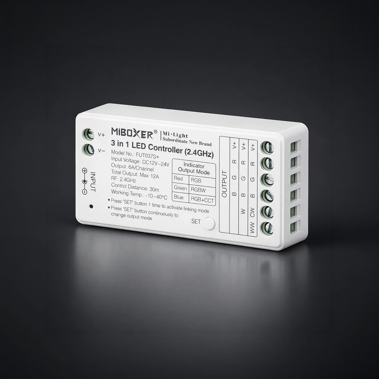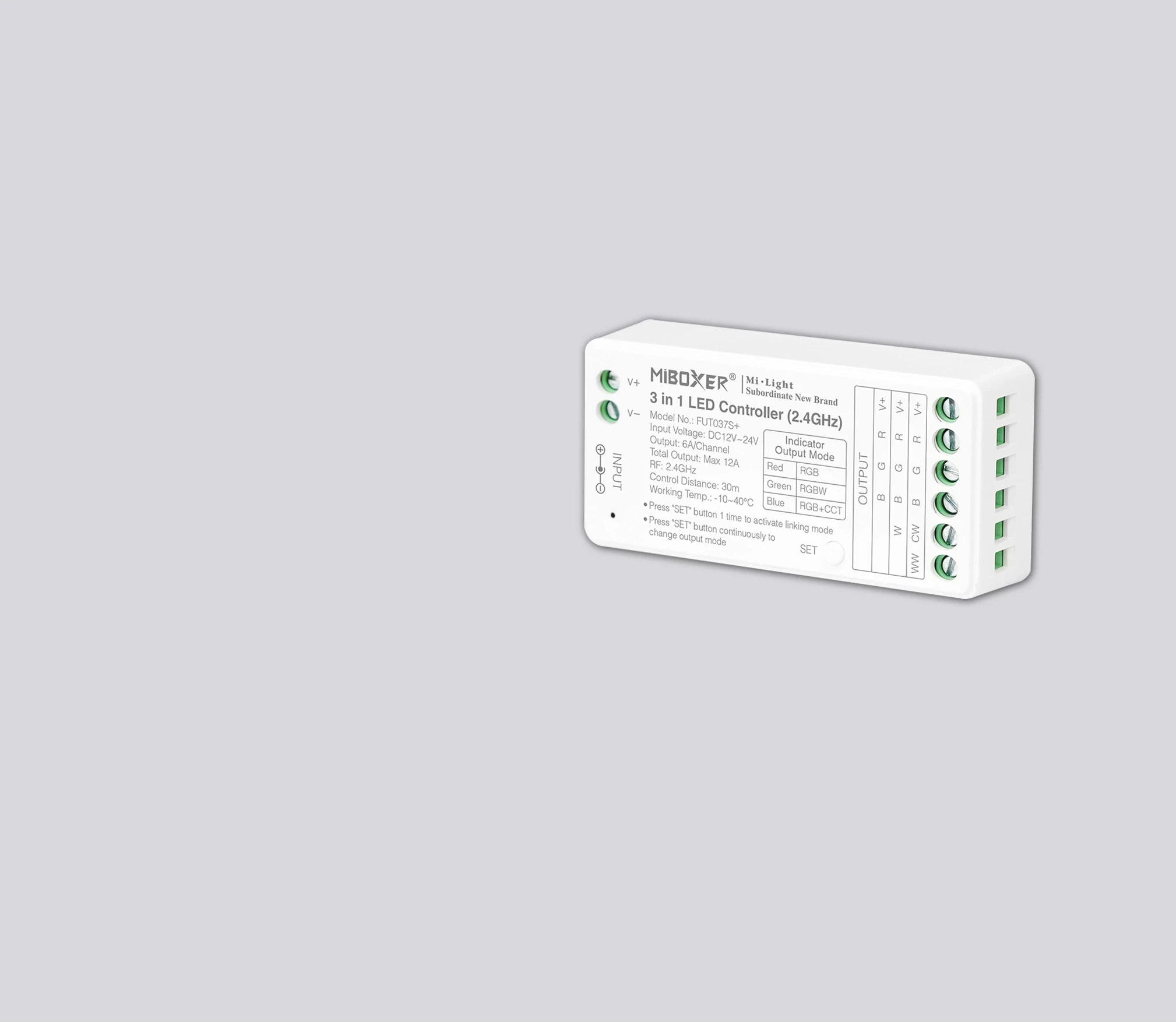FUT037S+ umożliwia sterowanie oświetleniem LED w trybach RGB, RGBW oraz RGB+CCT przy użyciu pilotów i paneli 2.4 GHz. Oferuje stabilną pracę i pełną kontrolę koloru bez konieczności korzystania z sieci WiFi.