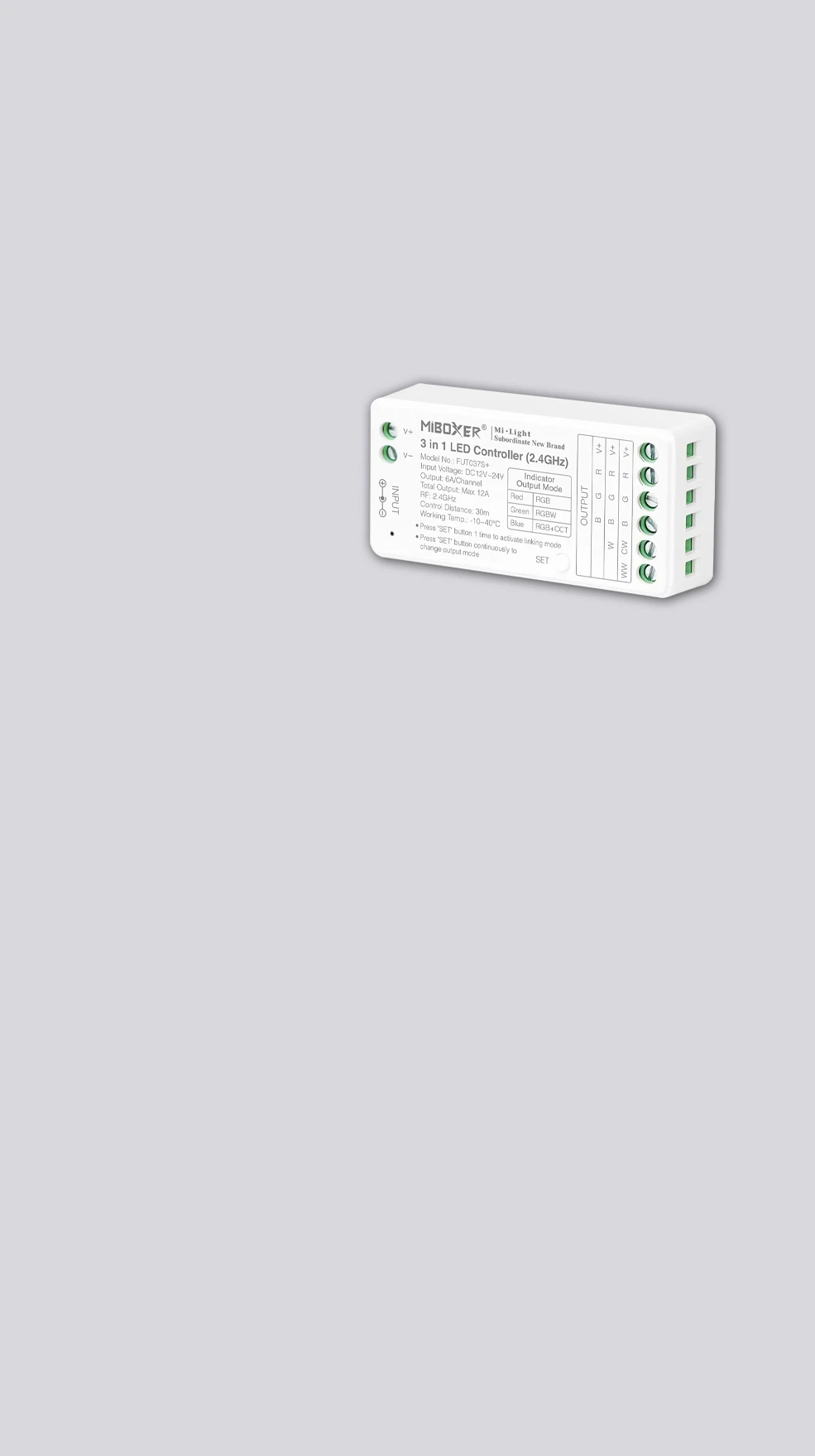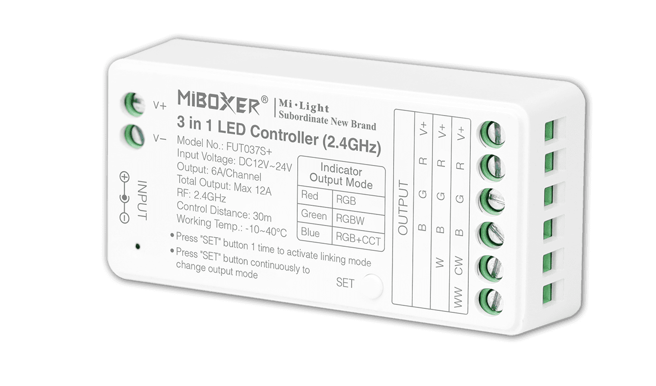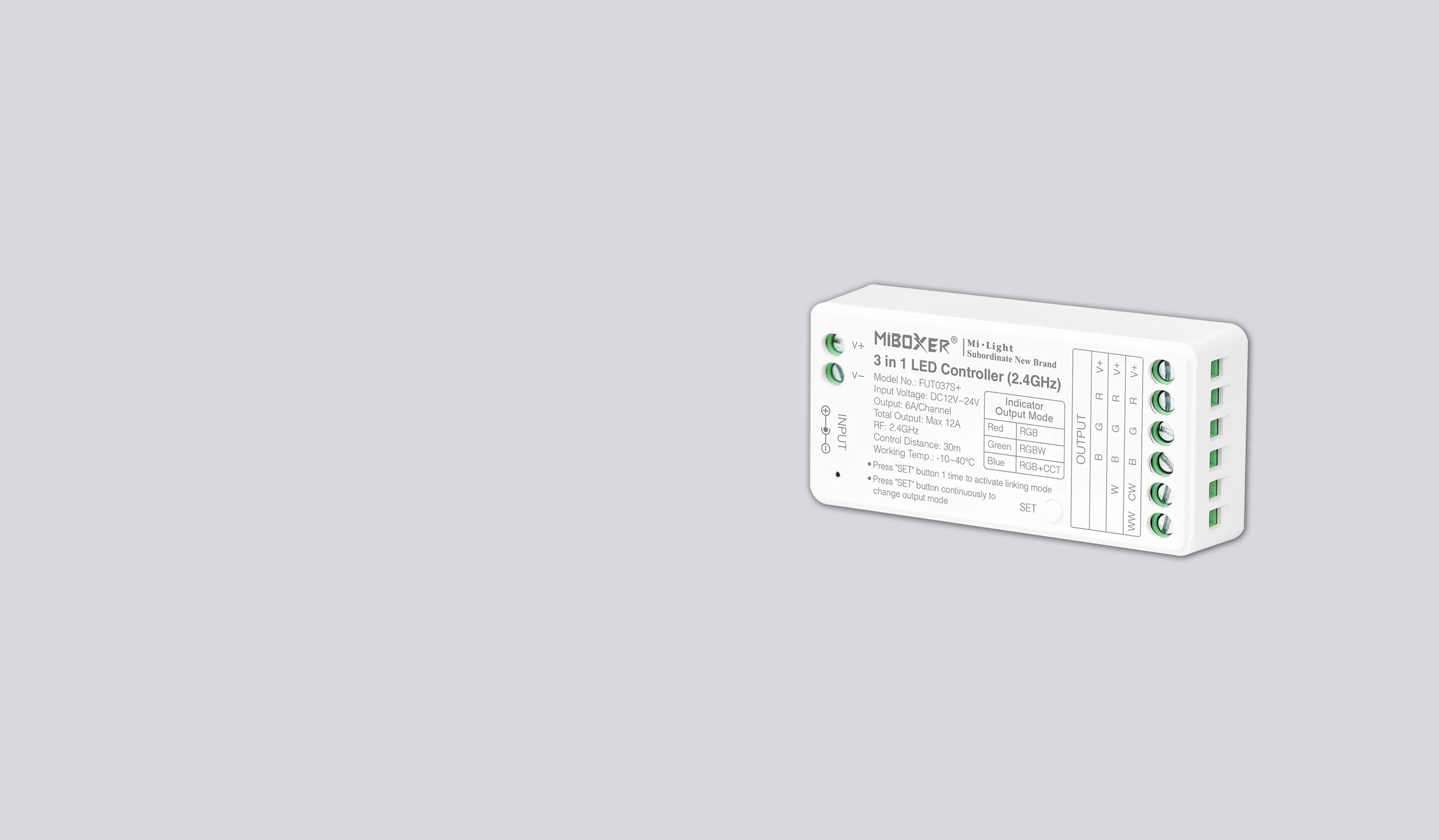 FUT037S+ umożliwia sterowanie oświetleniem LED w trybach RGB, RGBW oraz RGB+CCT przy użyciu pilotów i paneli 2.4 GHz. Oferuje stabilną pracę i pełną kontrolę koloru bez konieczności korzystania z sieci WiFi.