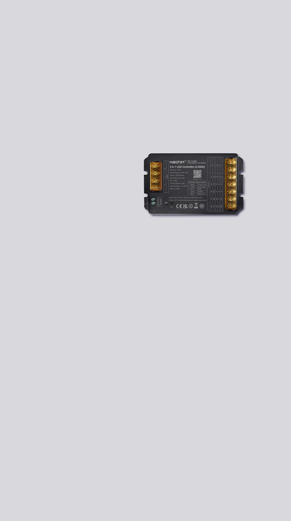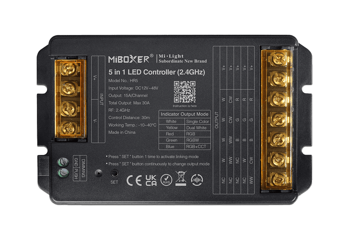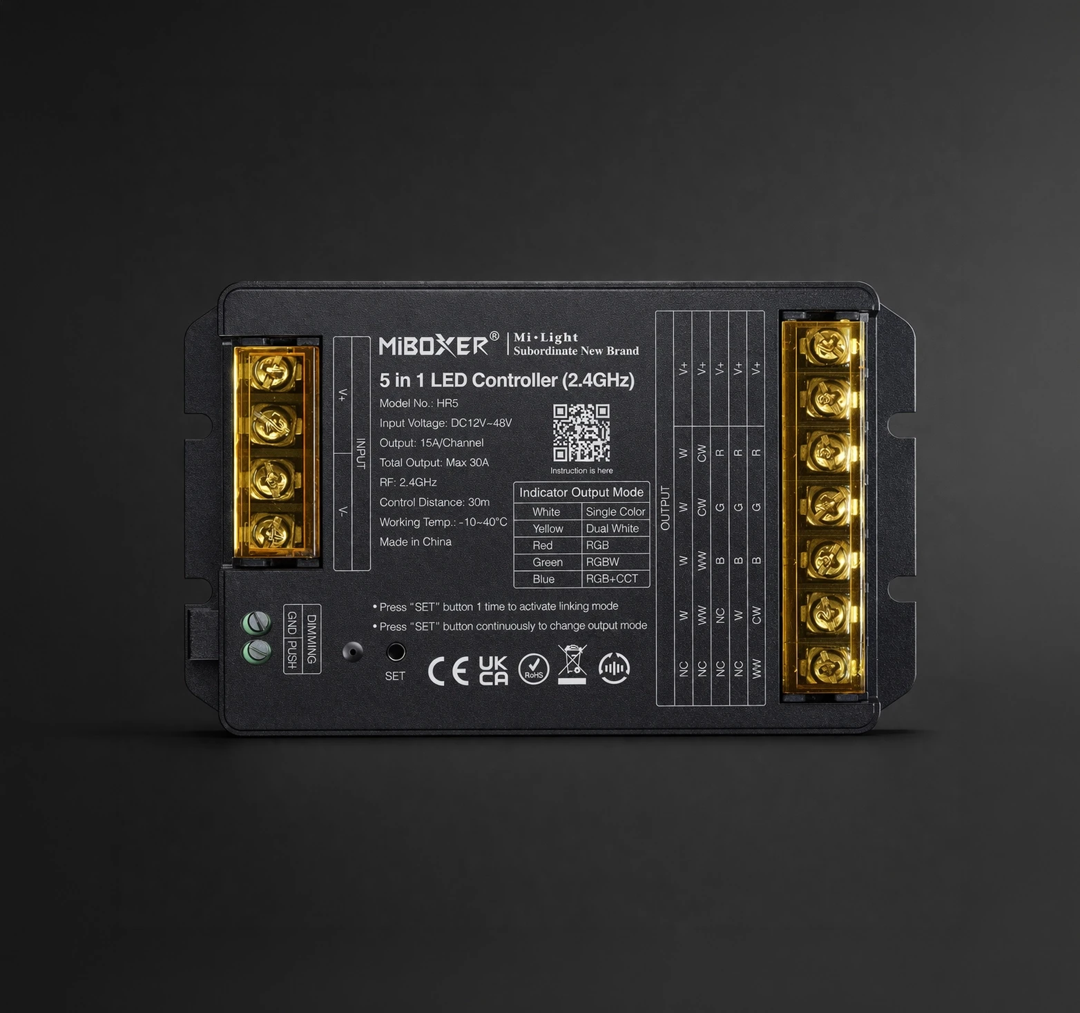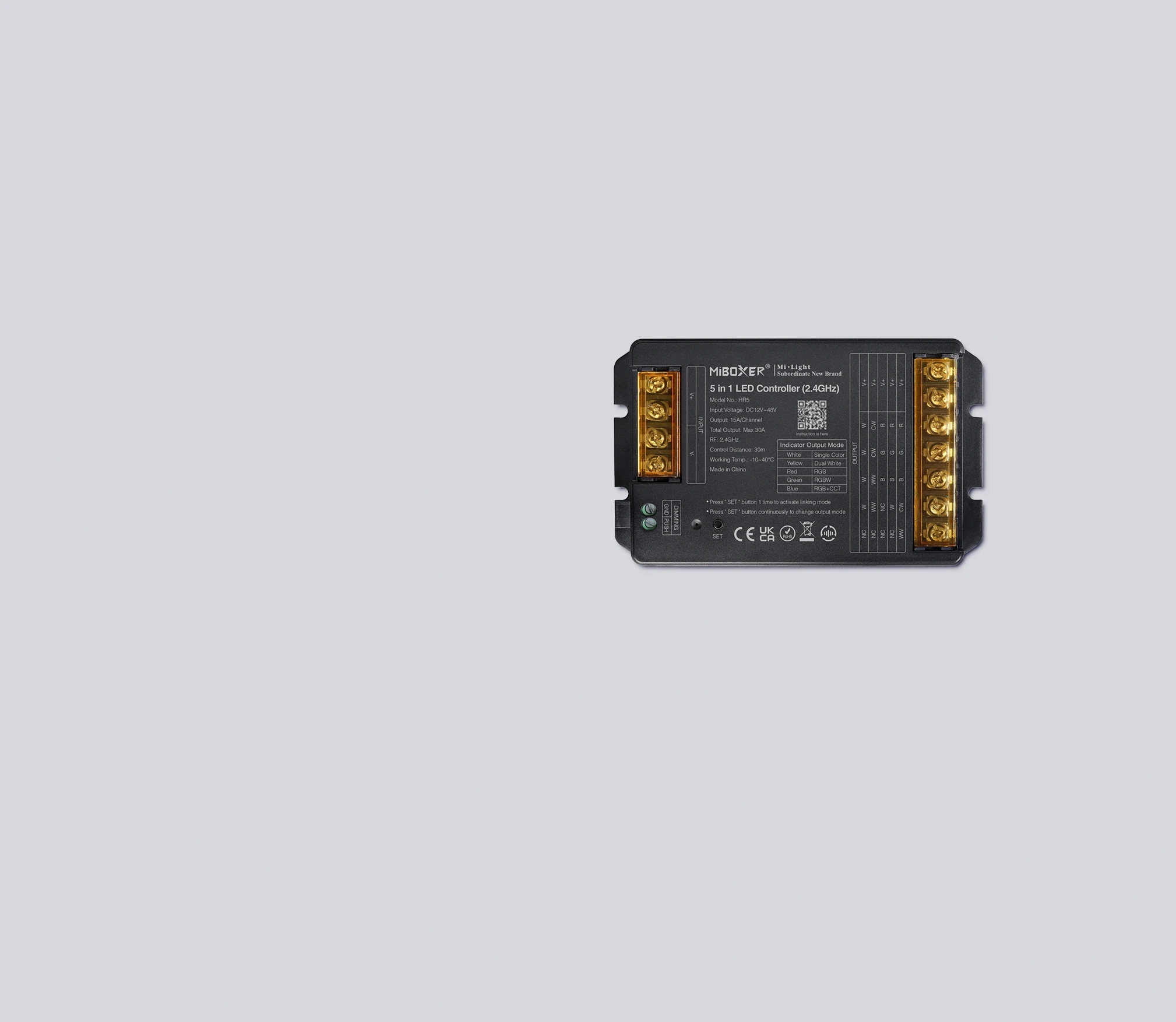 HR5 umożliwia sterowanie oświetleniem LED w trybach MONO, CCT, RGB, RGBW oraz RGB+CCT przy użyciu systemu 2.4 GHz. Sprawdza się w rozbudowanych instalacjach domowych i komercyjnych.