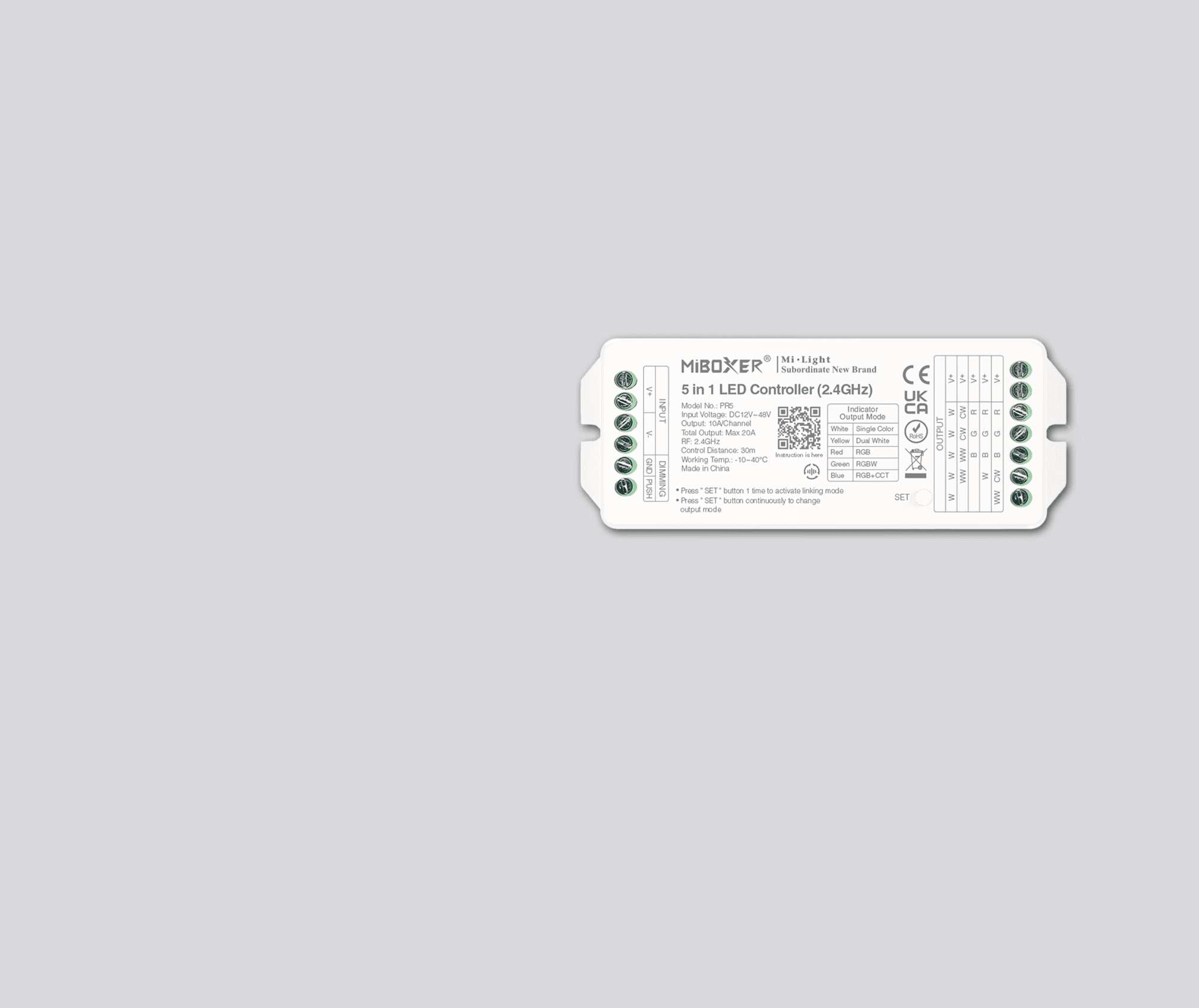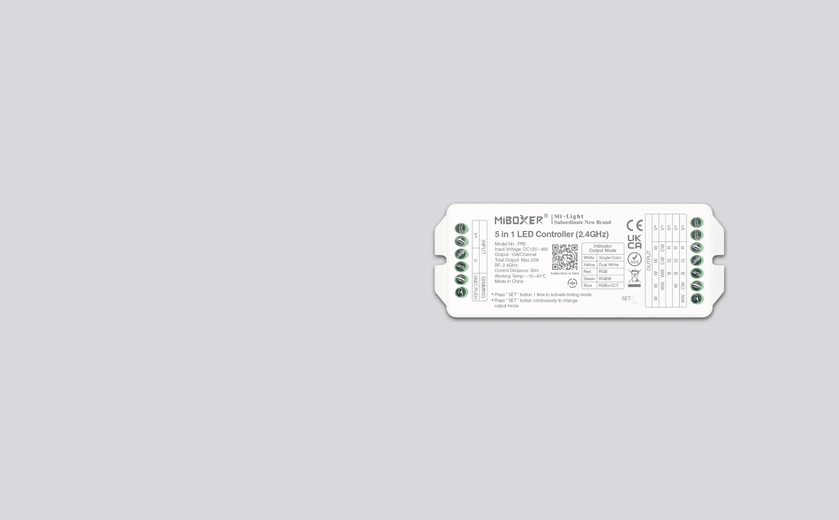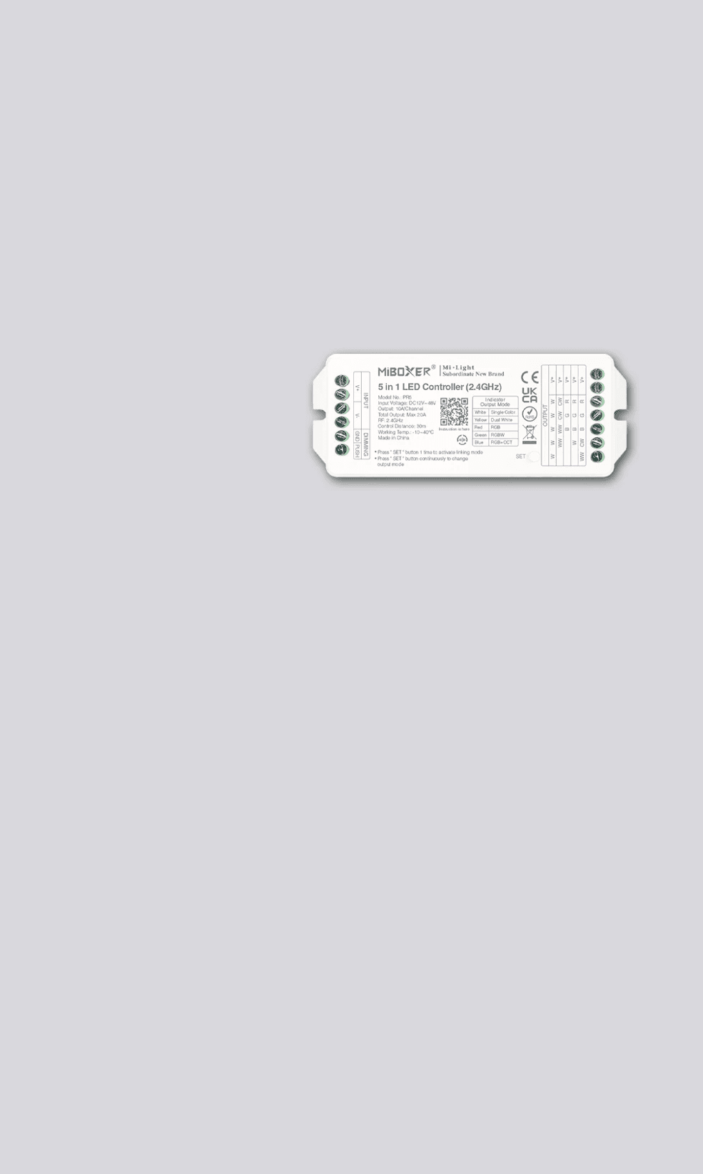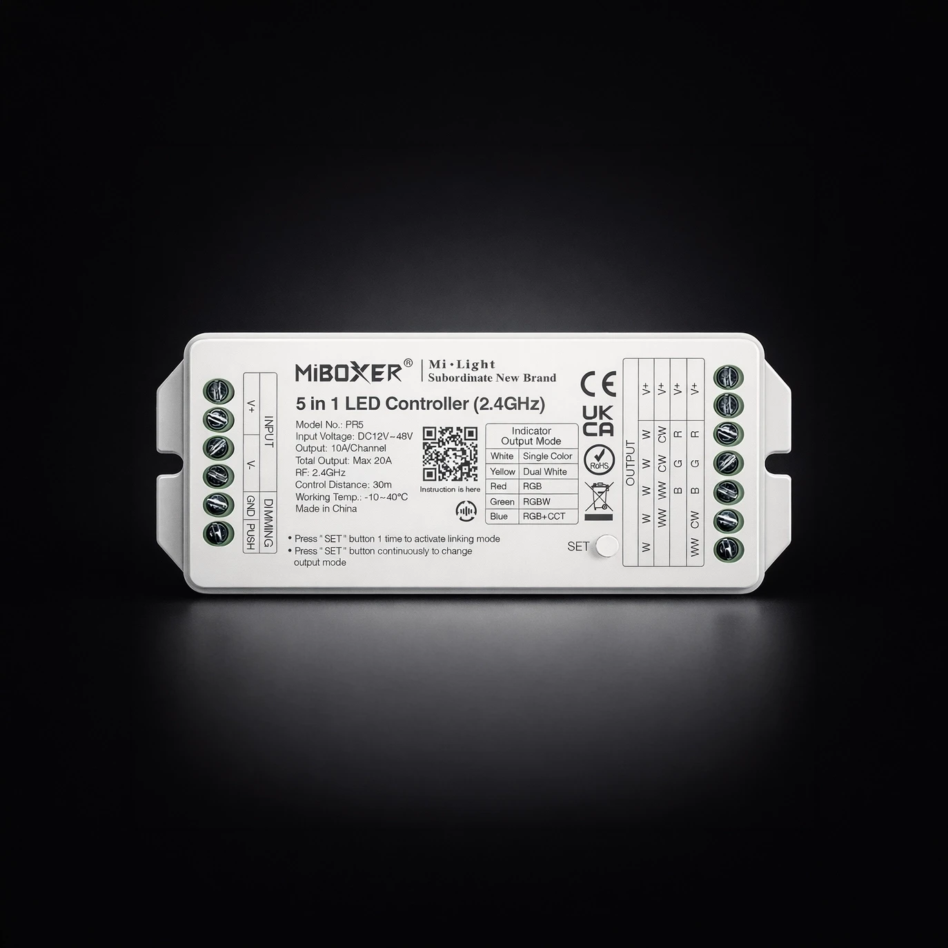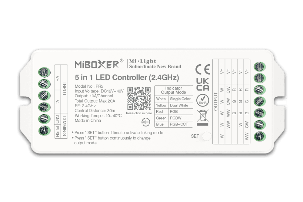 PR5 umożliwia sterowanie oświetleniem LED w trybach MONO, CCT, RGB, RGBW oraz RGB+CCT przy użyciu systemu 2.4 GHz. Oferuje szeroką kontrolę światła i funkcje automatyzacji.