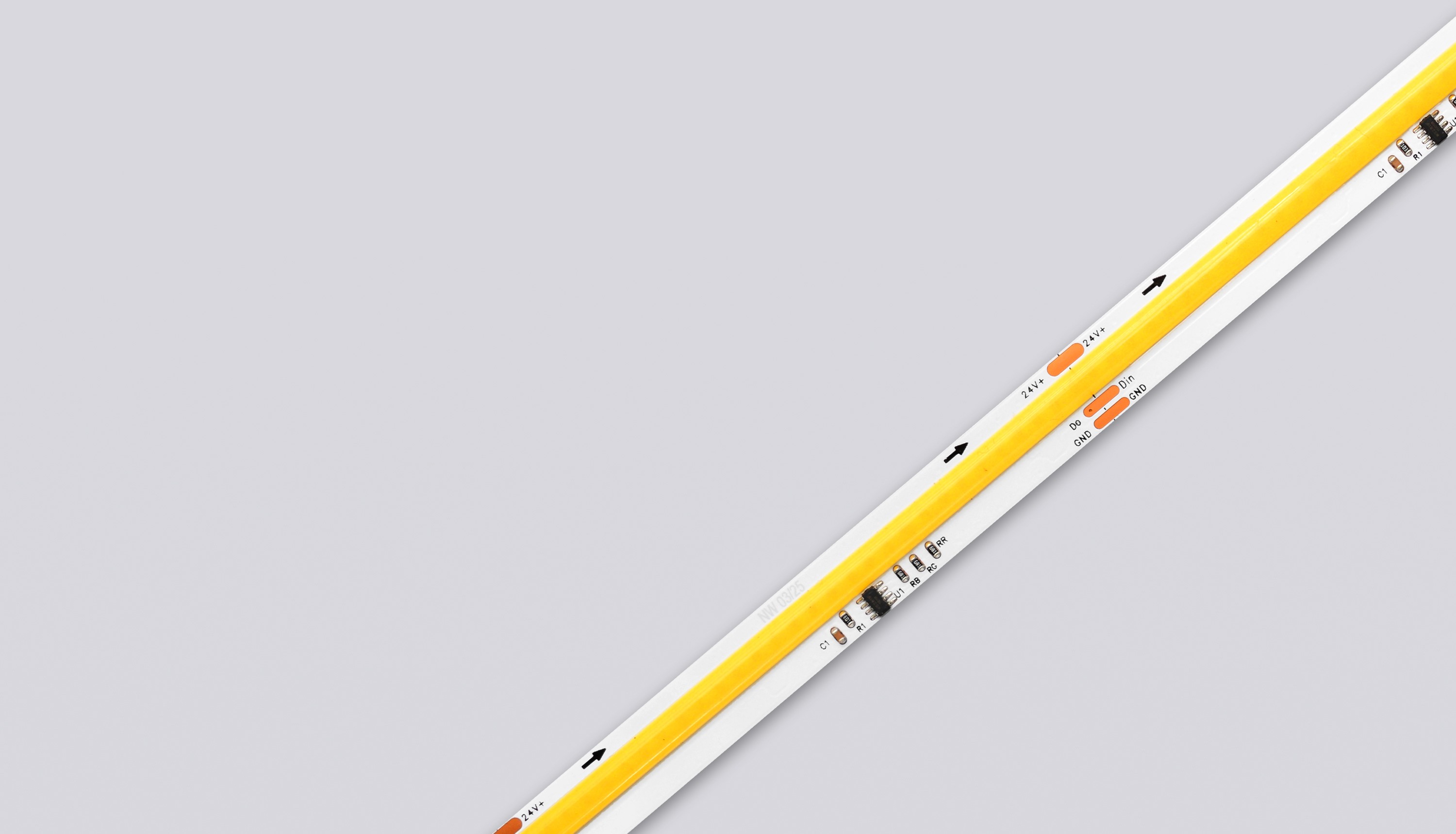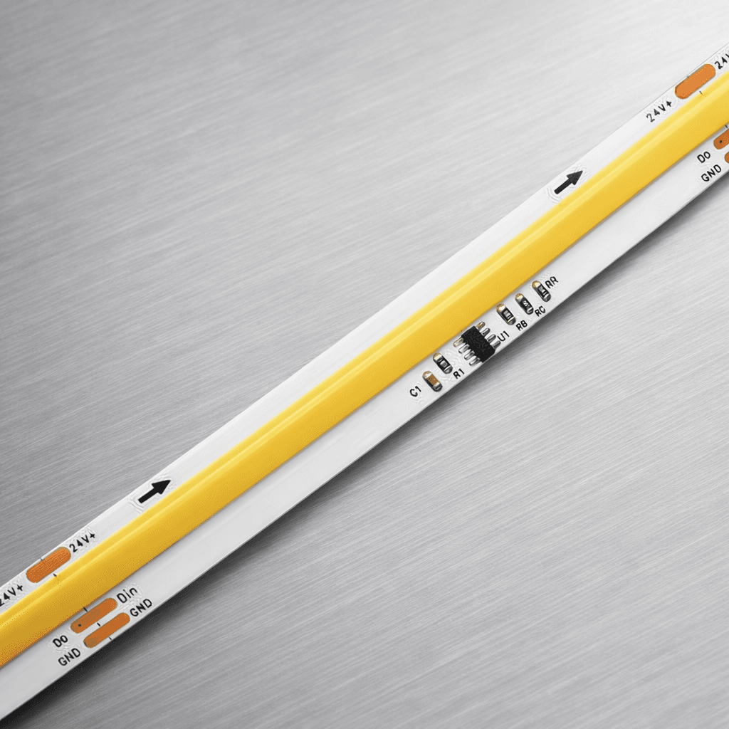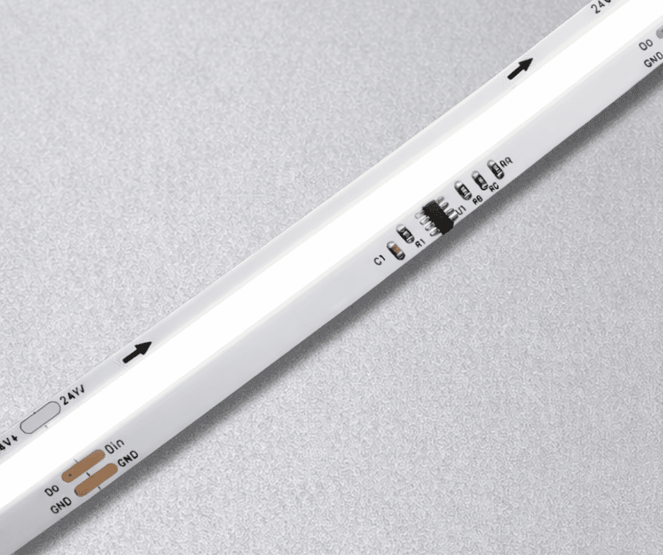 Cyfrowa taśma LED COB z indywidualnie programowalnymi pikselami, umożliwiająca tworzenie płynnych animacji świetlnych przy zachowaniu jednolitej linii światła.