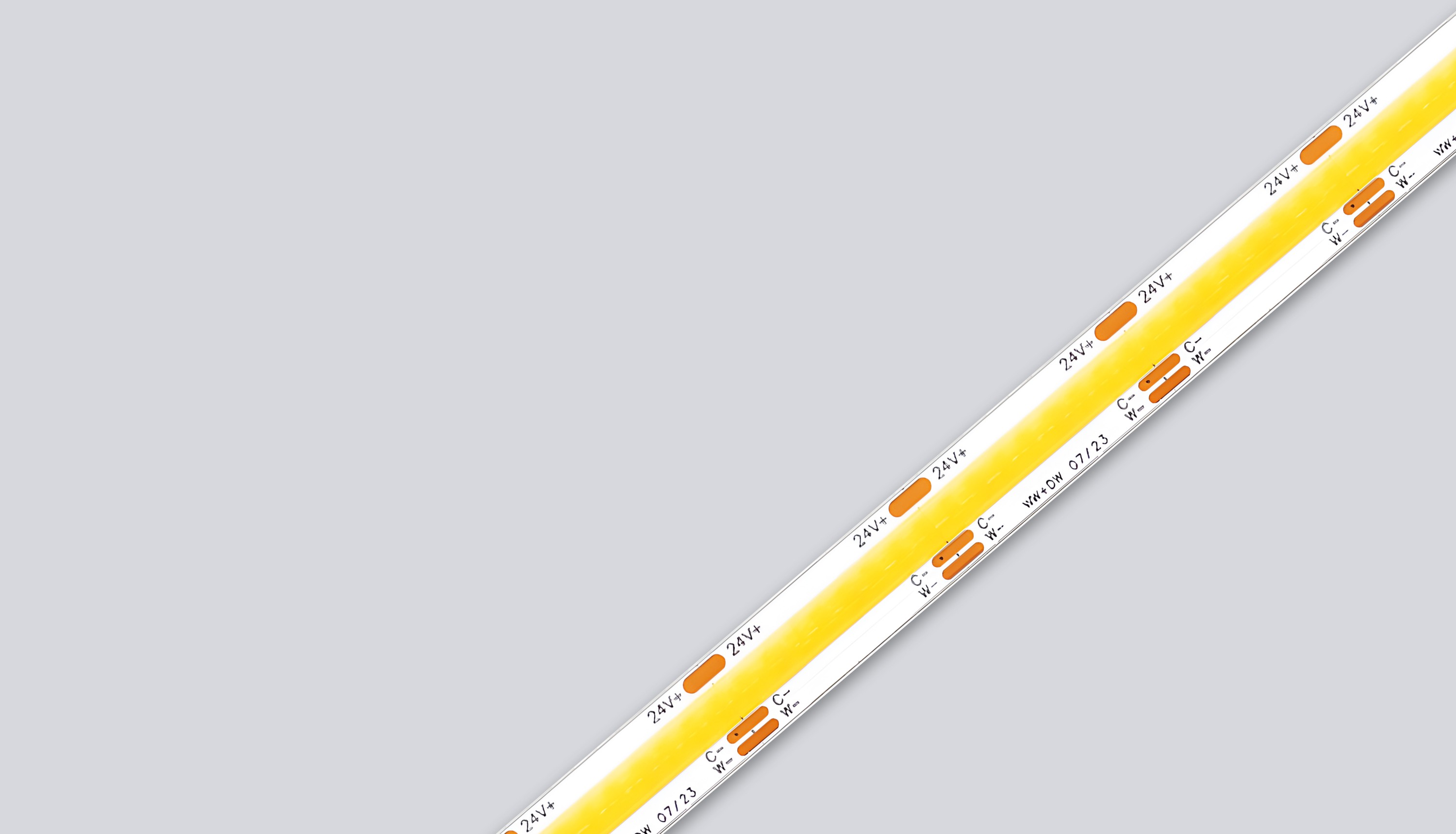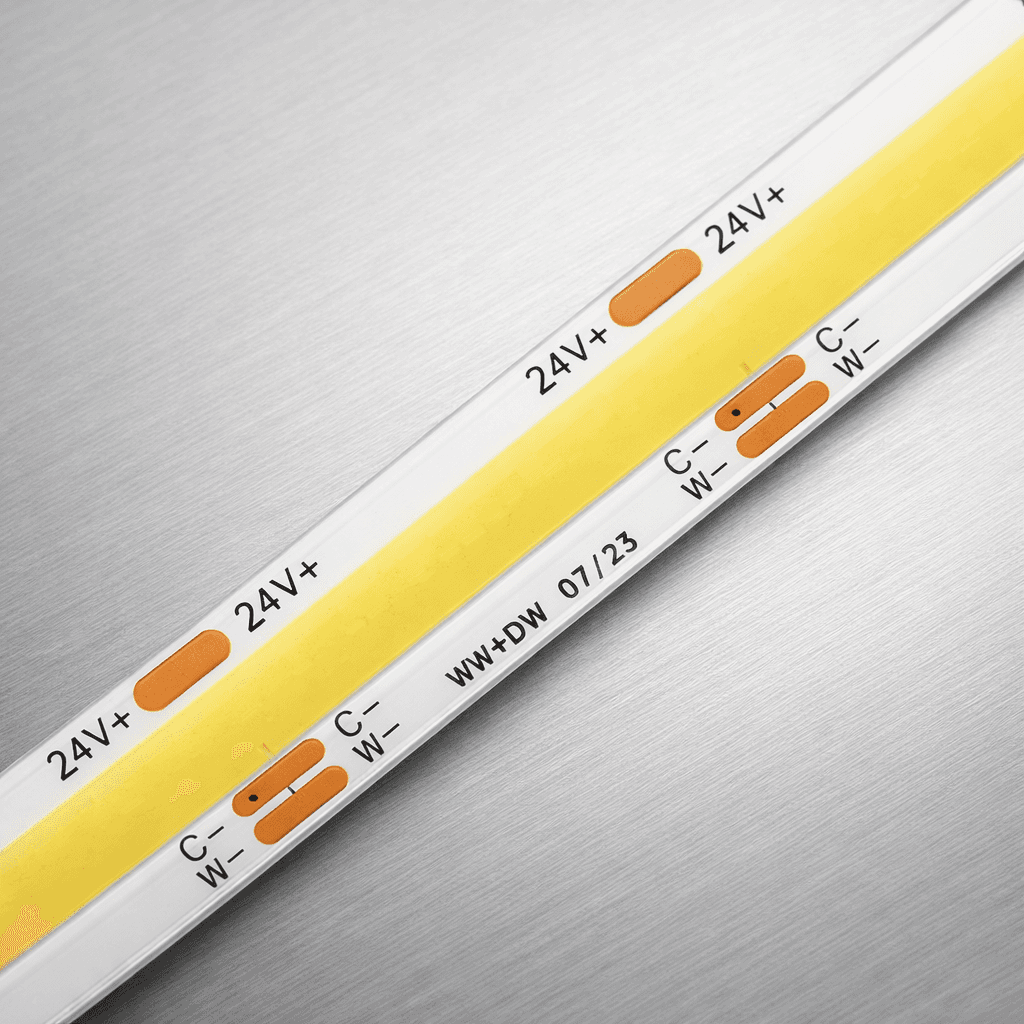 Profesjonalna taśma LED COB typu Dual White, umożliwiająca płynną regulację barwy światła od ciepłej do zimnej bieli. Dostępna w wersji IP20 oraz IP65.